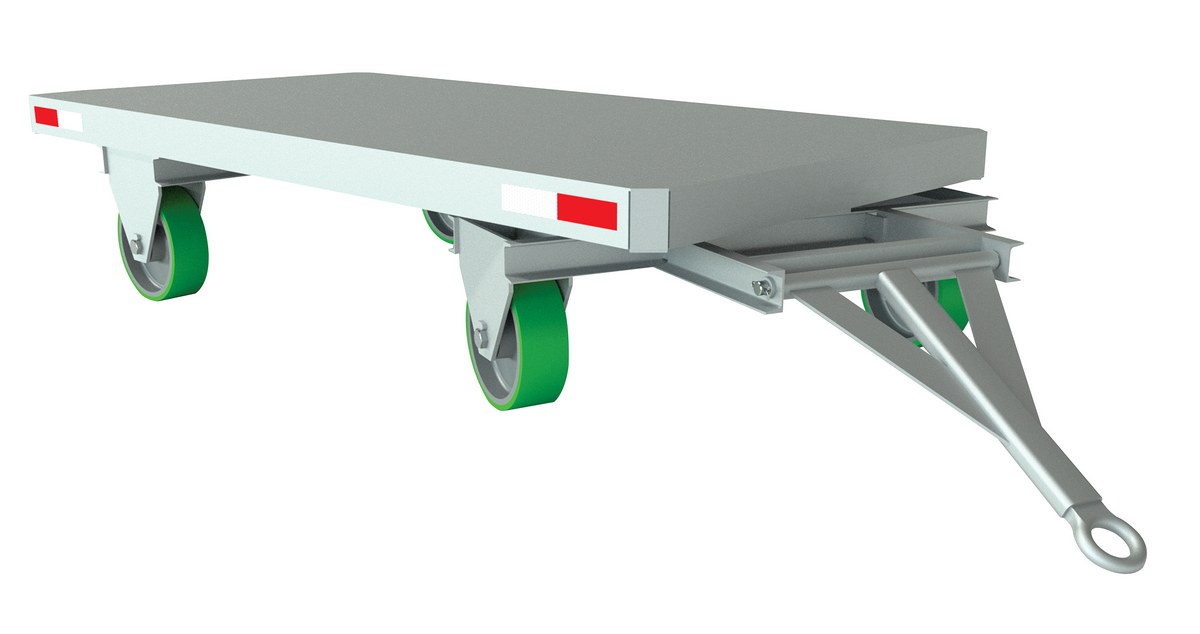 Fifth Wheel Steer Trailers feature steering that resembles children's little red wagons. These industrial workhorses move heavy loads around plants and distribution centers. 14" square steel plates sandwich a UHMW disk, secured by a 1-1/4" kingpin, comprising the massive fifth-wheel assembly. Equipped with proper couplers, fifth wheel steer trailers can be connected into "trains" to move even larger loads of merchandise. Front and rear axles are precisely located for optimal steering and load accommodation. Custom deck sizes and hardwood decks available, contact factory.