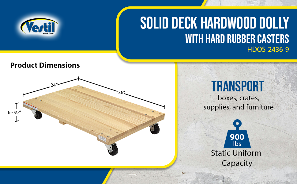HDOS-2436-9 HDOS-2436-9Hardwood Solid Deck Dolly 36 In. x 24 In. x 6-3/16 In. 900 Lb. CapacityUniform Static Capacity (lb.): 900