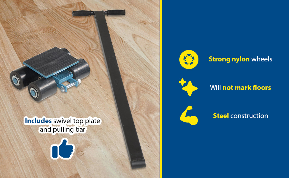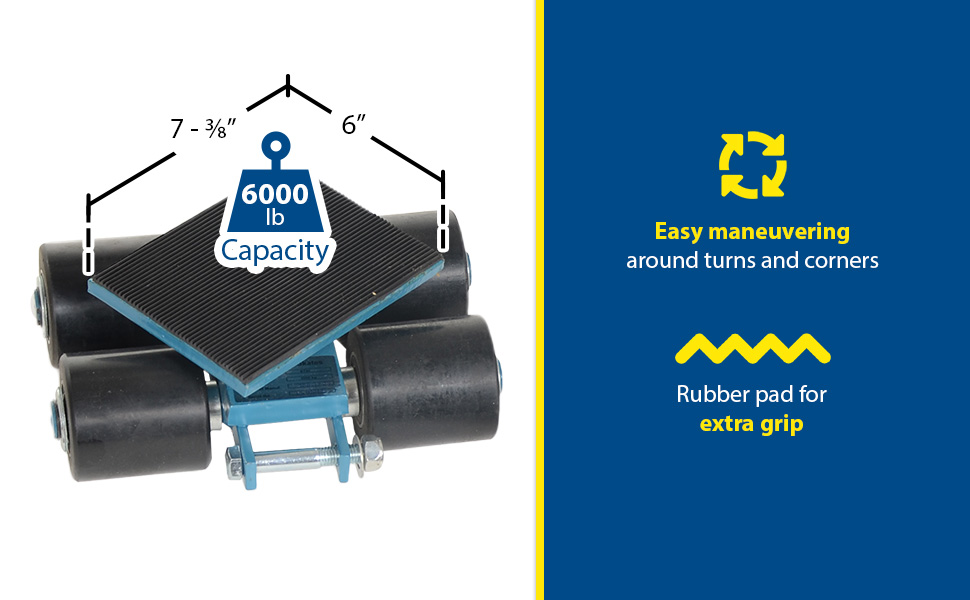 Sometimes moving heavy equipment can be a difficult process. But, with a machinery skate things get a whole lot easier! The high capacity design lets the user transfer large, heavy, and oversized loads without the need of costly industrial lifting equipment.These skates are designed to move heavy equipment and machinery. Nylon wheels are strong and will not mark floors. The top of each skate includes a rubber surface for extra grip. Steel construction with handle to carry and position.