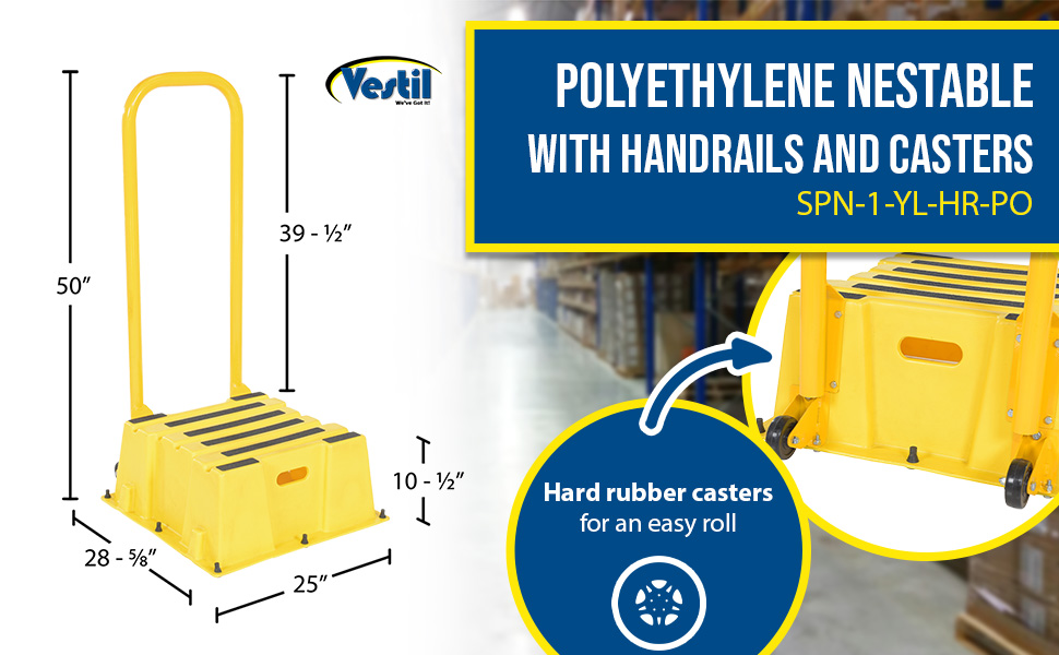 SPN-1-YL-HR-PO SPN-1-YL-HR-POPolyethylene Nestable with Handrails Casters 1 Step 500 Lb. Capacity YellowUniform Capacity (lb.): 500