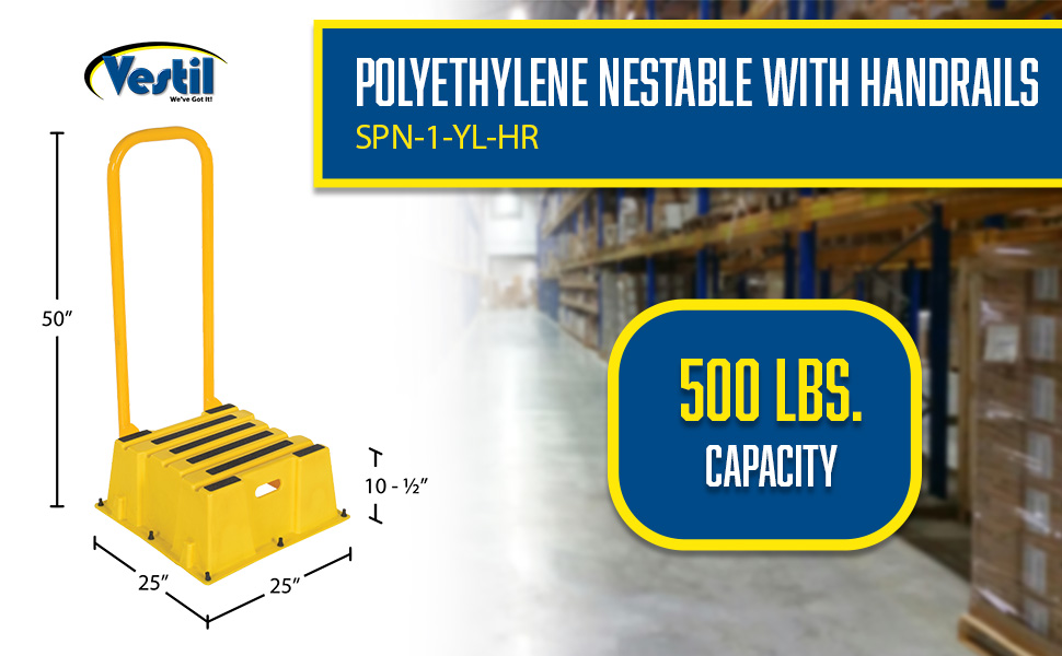 SPN-1-YL-HR SPN-1-YL-HRPolyethylene Nestable with Handrails 1 Step 500 Lb. Capacity YellowUniform Capacity (lb.): 500