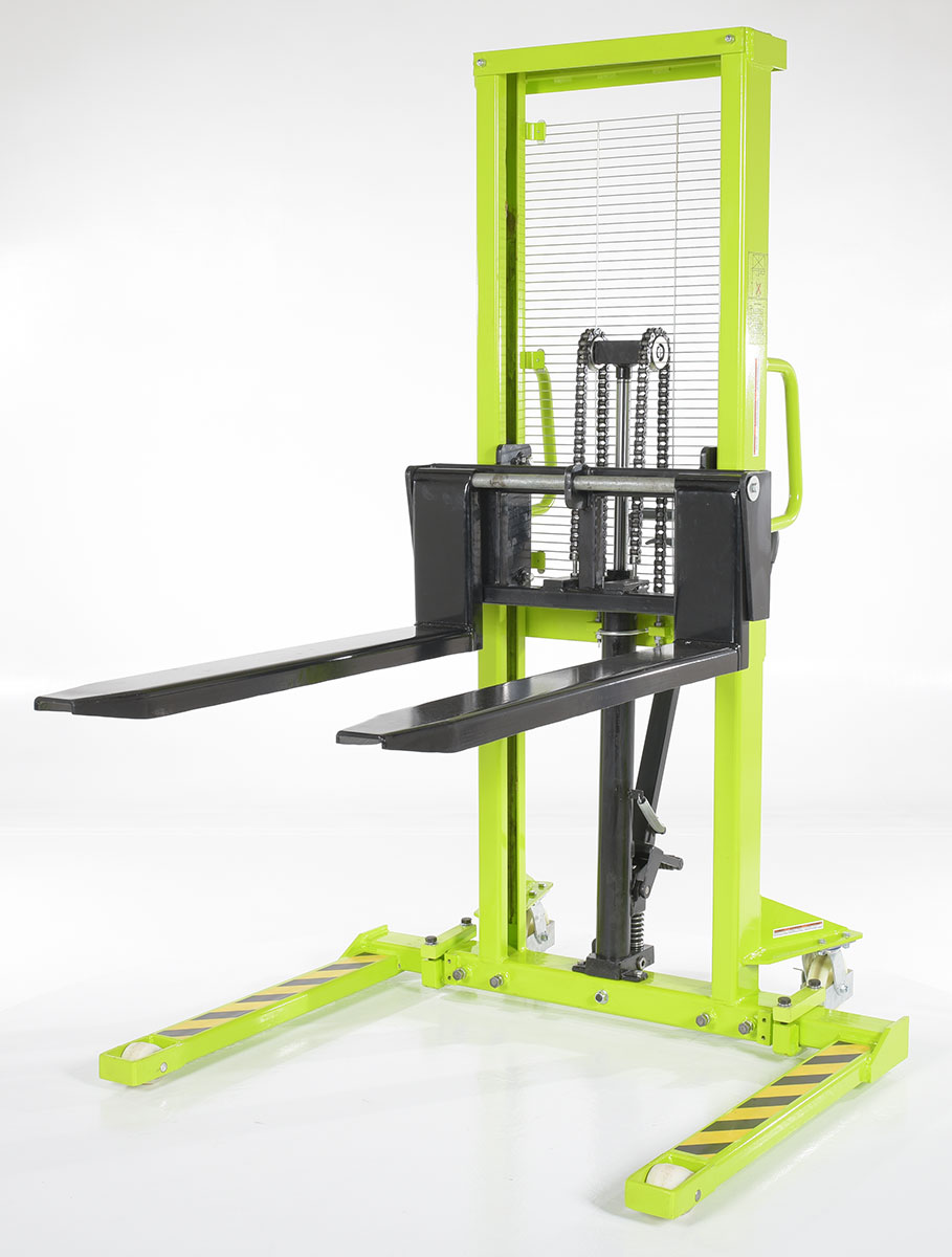The Variable Height Stacker is great for a variety of warehousing departments. The unit is constructed of steel for strong support and durability during day to day use. The color is bright for high visibility from across crowded workplaces. The manual hand pump functionality is perfect for rising to precise positions. To use, simply slide forks of the unit through the pallet openings and lift to desired height.