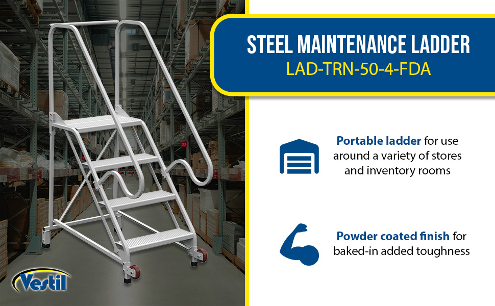 LAD-TRN-50-4-FDA LAD-TRN-50-4-FDASteel Tip N Roll FDA Compliant Ladder 50 Degree 4 Grip Strut 24 In. Step Width 350 Lb. Capacity WhiteUniform Capacity (lb.): 350