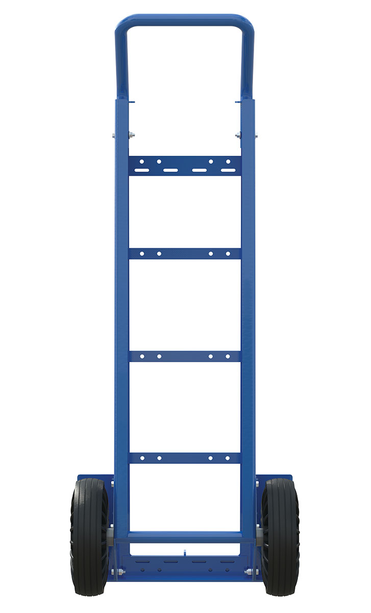 A standard hand truck isn't enough? Time to upgrade to a hand truck with forks. Forks allow the user to gather and maneuver large items that wouldn't fit securely on a standard hand truck. The forks are adjustable for a more precise fit, depending on the size of the product being transported. When not in use, the forks fold vertically into the body of the unit for more compact storage. Large wheels absorb shock when traversing over uneven or rough surfaces. Powder coated finish for added toughness.