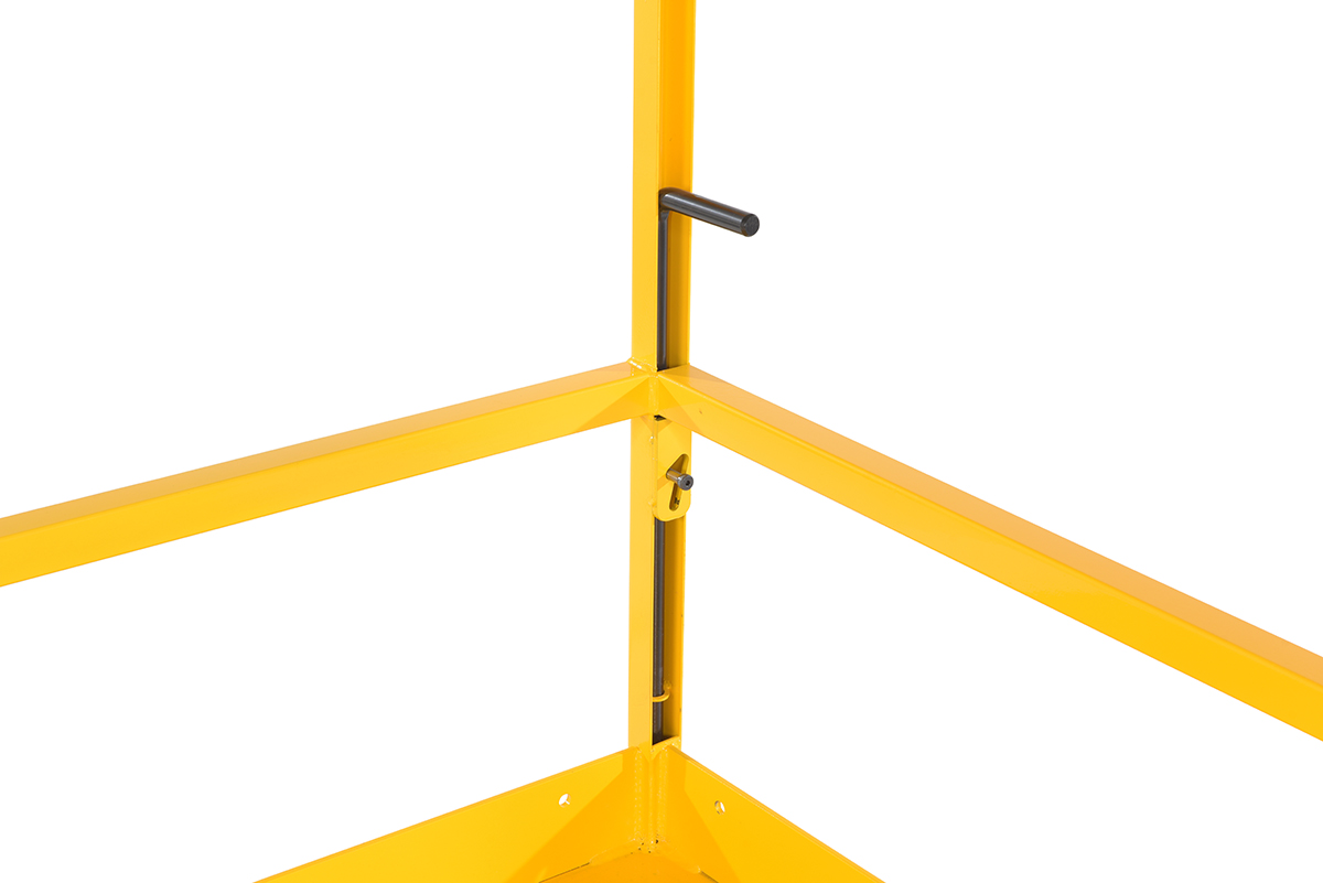 Safety has always been the number one priority of the rotating mezzanine system. The rotational design can be maneuvered into different positions with minimal manual labor, simplifying the loading unloading process. The mezzanine system includes three gated sides and one open side, ensuring security and stability of both personnel and items. The single open mezzanine side enables pallets and boxes to be transferred safely and efficiently. An extended height, raised lip, on the three gated sides limit possible slide-offs of any small items. Unit includes a yellow and black powder coat finish for baked in added toughness.