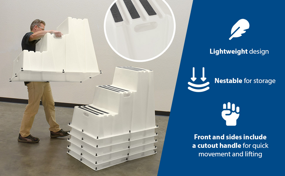 A Nestable step stool is a great asset for on the go or in a permanent setting. A lightweight design allows the stool to be easily transferred to a preferred location. Front and Sides include a cutout handle for quick movement and lifting. The steps surface style encourages safe footing while traversing up and down the steps.