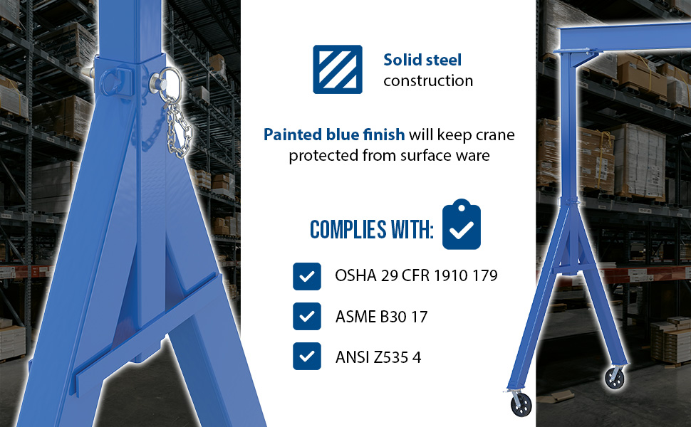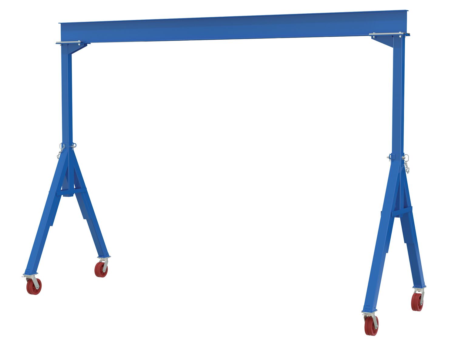 The fixed height steel gantry crane is designed for transporting and positioning materials along the beams length. The solid steel construction will provide years of service, while the painted blue finish will keep the models protected from surface ware. Unit comes standard four (4) V-groove casters, allowing for quick movement and positioning adjustments. The unit is an economical and efficient way to lift and raise products, diminishing the need of additional personnel. The fixed height design allows for constant use in a particular setting without the need to maneuver the overall height of the unit.Do not move units while loaded unless using V-Groove Caster and Track Option. Hoists & Trollies can be ordered seperately.