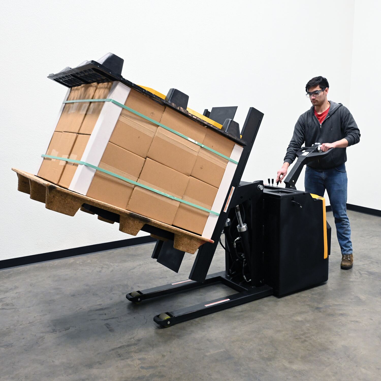 Tilt (powered) and rotate (manual) loads with our durable Pallet Inverter. Low profile design allows the operator to stand on the rider platform and steer the load from workstation to workstation quickly and easily. DC power lift and drive makes operation safe and efficient. The ergonomic handle features easy to operate throttle with infinite forward and reverse speeds, tilt/lower controls, safety belly reverse button, and horn. Features an electromagnetic disc brake with automatic dead-man feature that activates when user releases handle. Includes (4) 6V batteries, an on-board battery charger, battery level gauge, emergency battery disconnect, and horn. Ideal in loading dock areas as a powered pallet truck, powered pallet tilter, or as a manual turntable. Rolls smoothly on polyurethane steer and load wheels.
