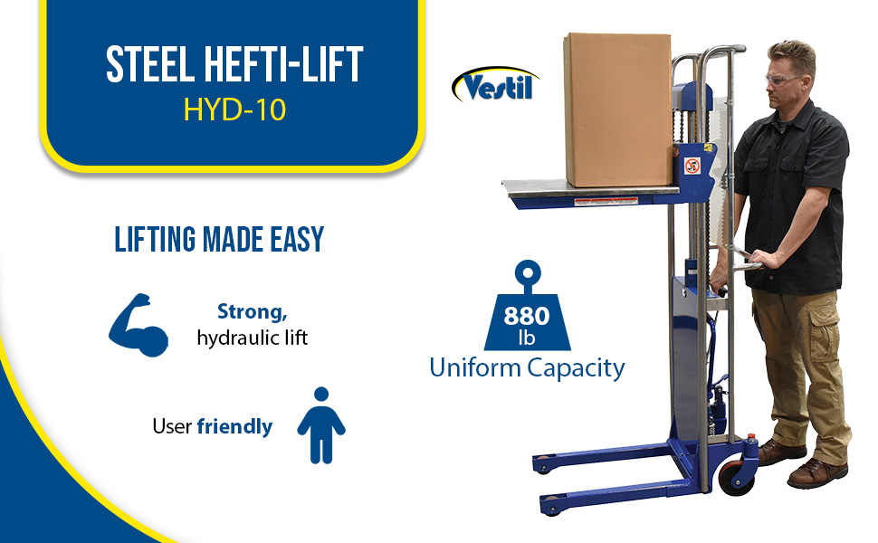The Hefti-Lift units provide reliable powerful lifting when moving and positioning loads. The manual hydraulic foot pump yields 3/4" of platform travel per stroke, auto-shift models feature a two speed foot pump.The units roll smoothly on two rigid and two swivel poly-on-steel casters with foot operated brake. The units are designed of welded steel construction with chrome platforms and uprights (except model HYD-10-DA-SS) Each fork is 4-1/2"W x 2-1/2"H, the fork length is the same as the platform length. Overall fork width is 22". Not for use with pallets. Stainless Steel units are compact, lightweight, and capable of turning in a small radius when space is limited. A built-in automatic load check valve is included for improved safety. Model HYD-5-SS features a hydraulic foot pump, while model HYD-10-DA-SS comes with a dual acting manual hydraulic hand pump.