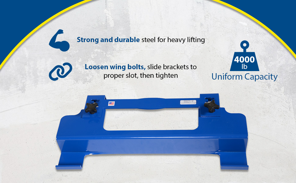 The Adjustable (PJ-2001) unit is designed to fit various types of electric pallet jacks. To use, simply loosen wing bolts and slide adjustable brackets to proper slot, then tighten wing bolts.