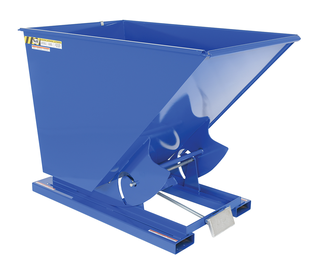 Hopper automatically dumps when bumper release contacts the front of the dumpster. Hopper returns to an upright and locked position automatically after it dumps. Also includes a cable that may be operated from the seat of the fork truck to manually dump the hopper. A safety restraint is provided to secure the hopper to the fork truck. Usable fork pockets are 7-1/2"W x 2-1/2"H. Self-dumping hoppers facilitate compliance with OSHA General Industry rule 29 CFR 1910.178(m)(5)(iii) by allowing lift truck operators to remain at the controls of their truck throughout the dumping process. Optional leak proof design sold separately. D-25, D-33, D-50, D-75, and D-100 are stackable if you stack the top hopper turned 90 degrees from the bottom. Blue baked-in powder-coated toughness is standard.