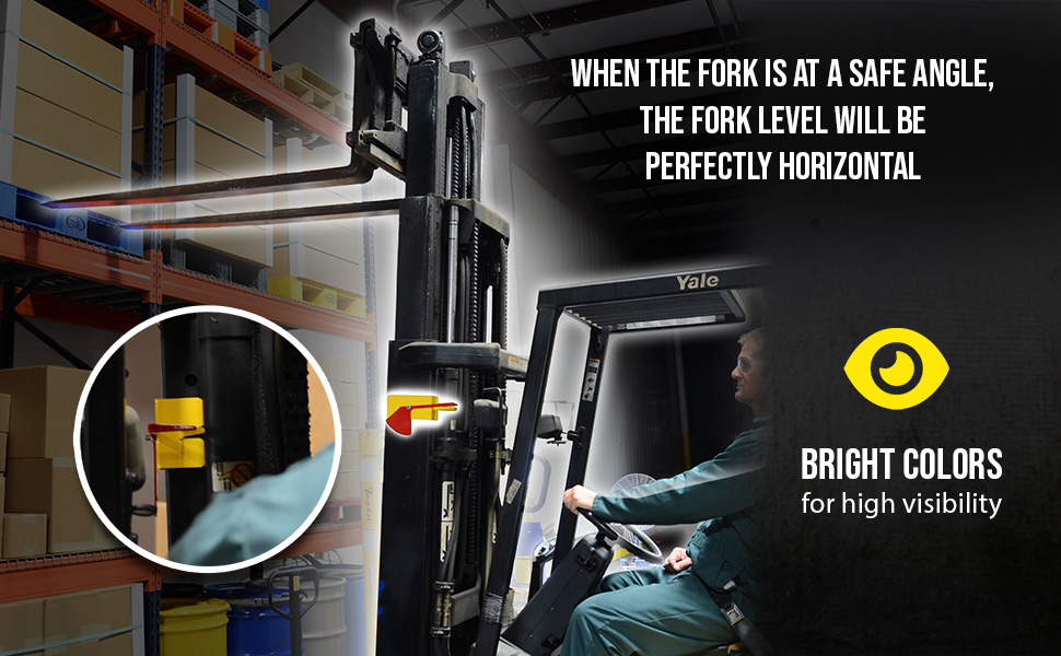 Designed to aid the fork lift driver in determining when the forks are level. Unit reduces the risk of damaging or piercing product when removing it from pallet racking. Fasten the steel leveler to the mast of the fork lift. While tilting the forks to the desired angle, the fork leveler will tilt as well, showing that the forks are not currently in a horizontal position. When forks are moved back into a safe level angle, the leveler will be perfectly horizontal.
