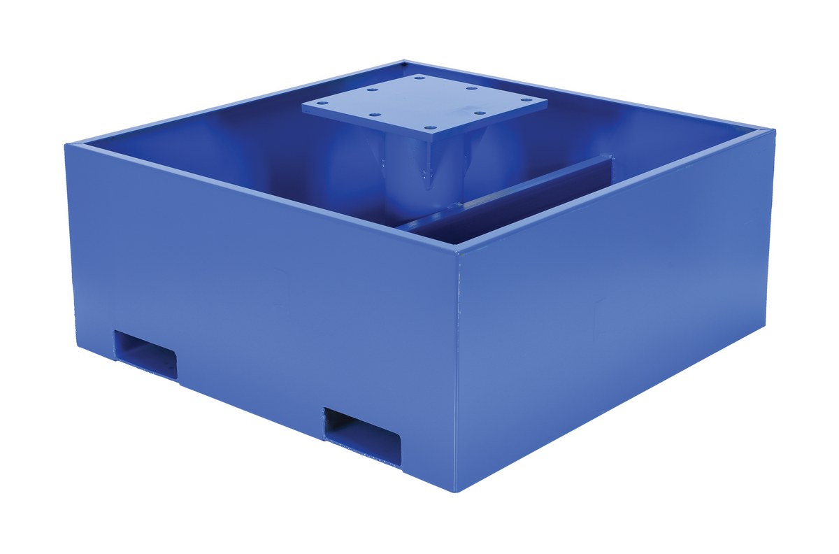 Unique design allows for easy transportation of jib crane with a fork truck. Empty base models include instructions for proper filling with concrete. Fillable base measurements are 42-3/16" x 42-3/16" x 18"H or 36"H and includes built-in fork tubes. Fork tubes are 7-5/8"W x 2-5/8"H usable on 24" fork centers, for transportation with fork truck. Fixed length I-beam will pivot 360 degrees for complete access. Under I-beam clearance is 10'. Upright vertical column bolts to base. Steel construction with blue painted finish. Units ship knocked down. Not for use as a fork truck attachment. Hoists & Trollies can be ordered seperately.
