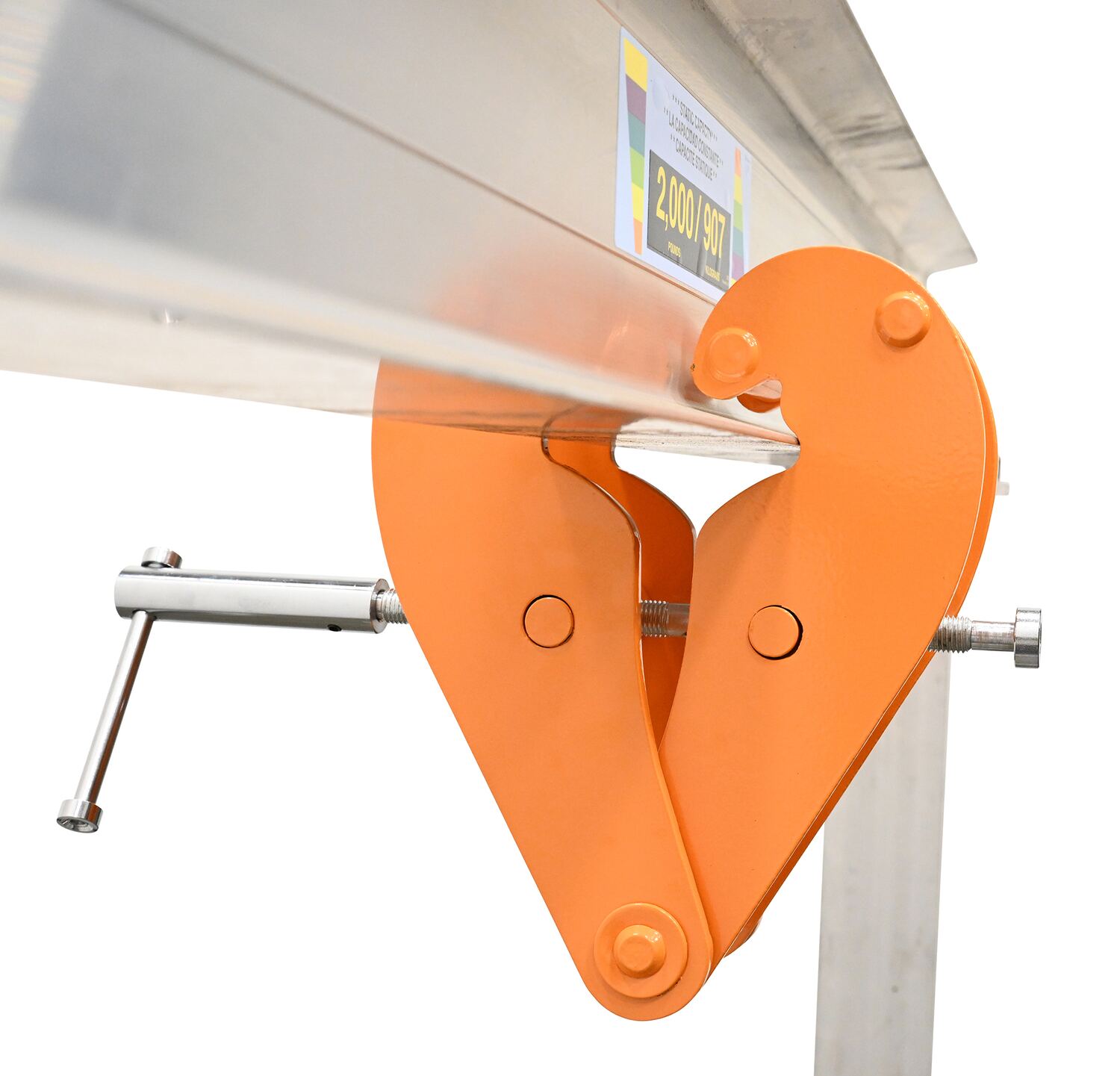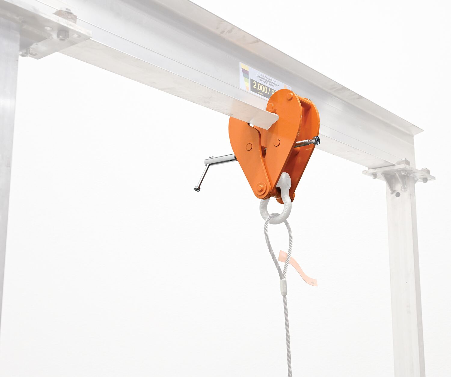BC-8Designed to reduce the I-beam flange stress by distributing loads away from the flange edges during overhead lifting applications. These versatile units can be interchanged from one gantry to another in a matter of seconds with its easy mechanical adjustment mechanism. A bar is located at the bottom of the beam clamp for attaching a hoist (sold separately). Steel construction and painted finish.