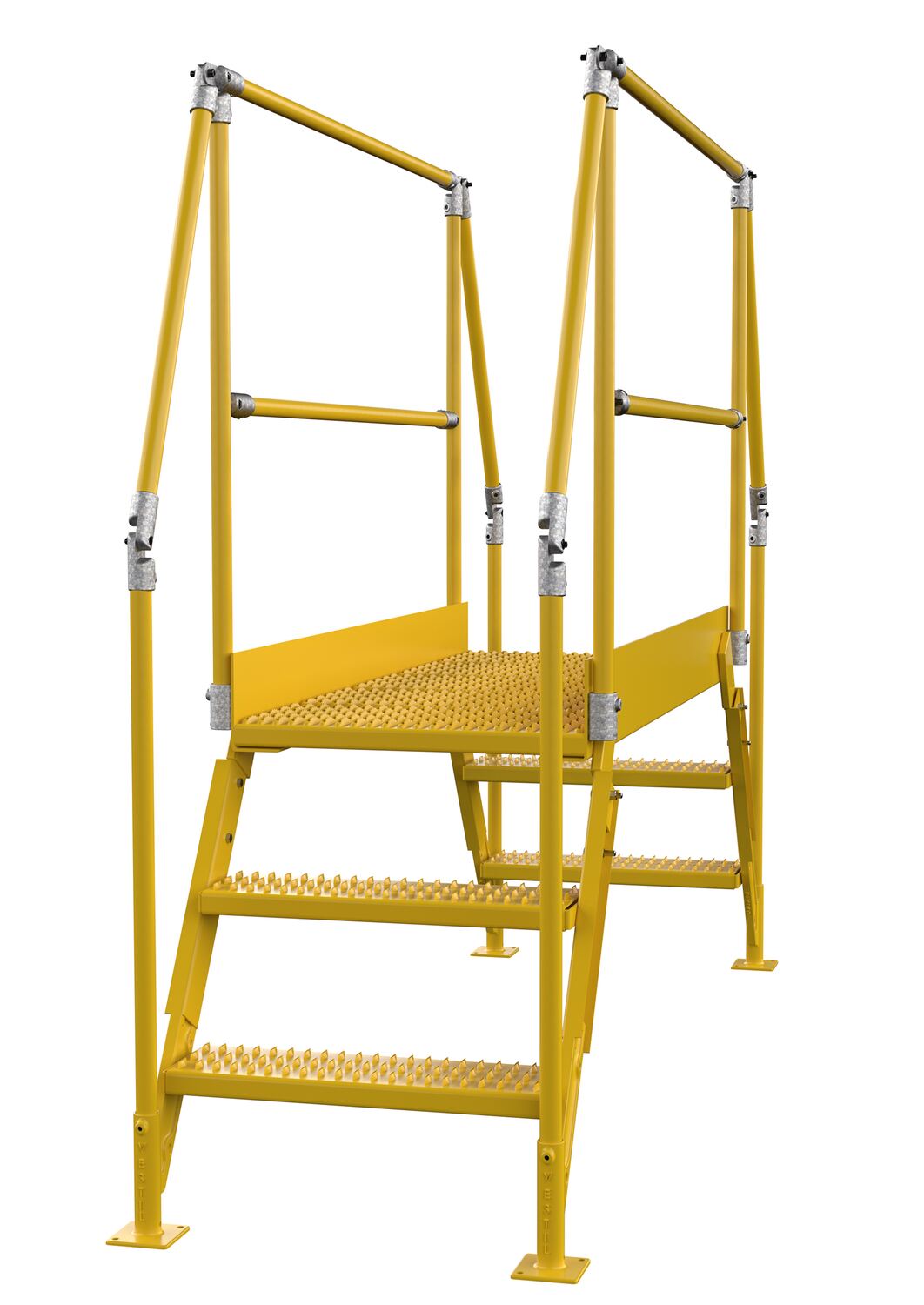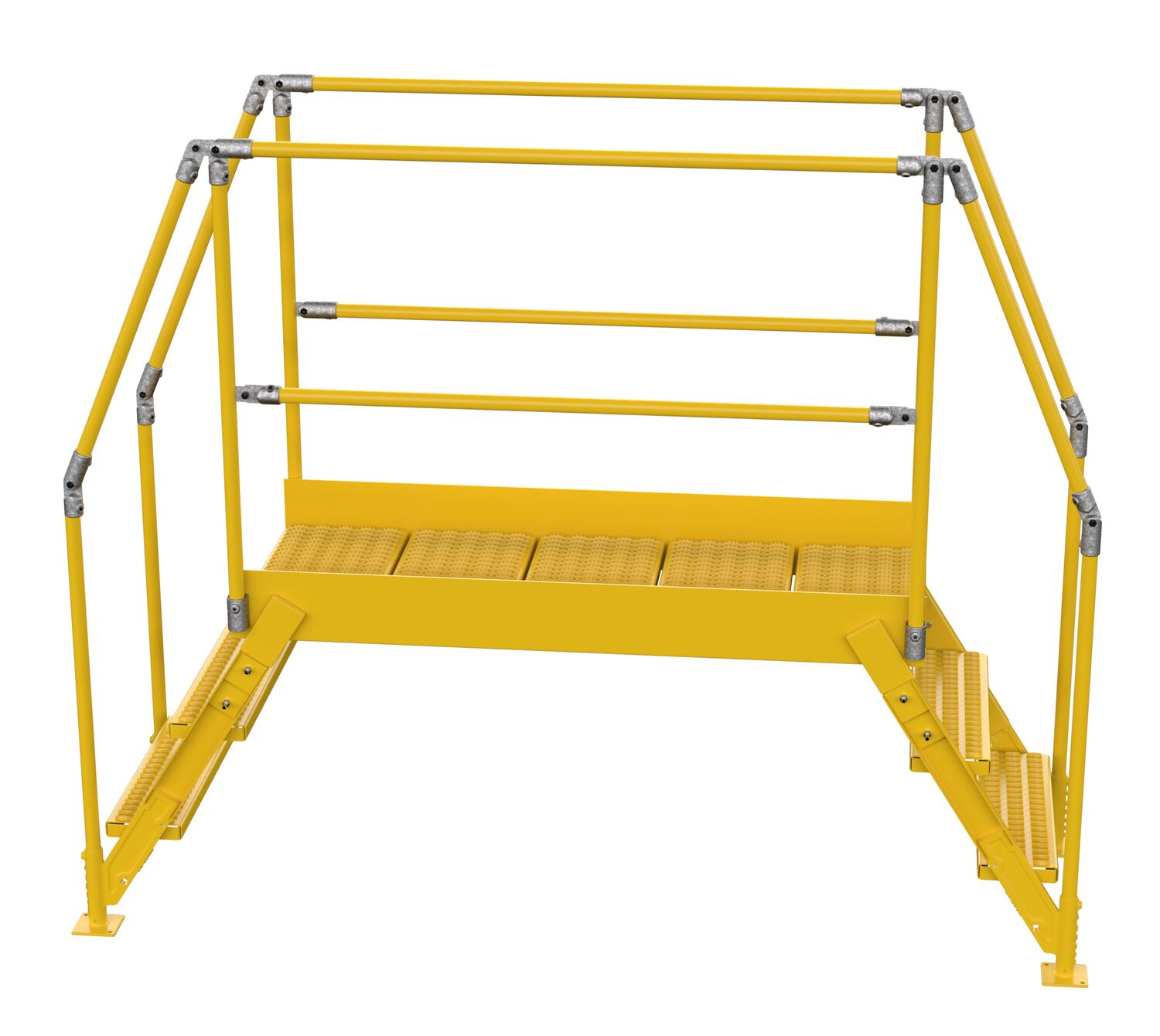 Mount where you need permanent access at crossover points. The upper platform features removable two sided 42-5/8" high handrail with 21" mid-rail and fixed 4" toeboards to prevent objects from rolling off. Serrated steps for extra grip and safety are 23-1/2" wide and 7" deep with a step spacing of 10". The angle of the steps is 58 degrees. The overall ladder width is 29-1/4". Ground legs include floor mounting pads. Units must be anchored to the floor. Units are all welded steel construction but can be knock-down for storage and shipping. Uniform capacity is 500 pounds. Meets ANSI A14.7 and OSHA 29 CFR 1910.24. Baked-in powder coat finish for added toughness.