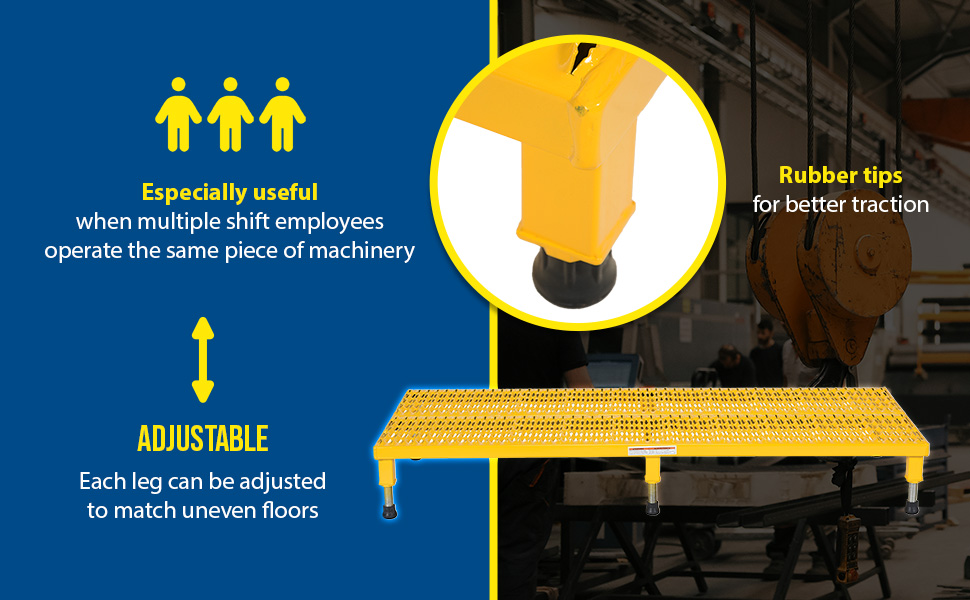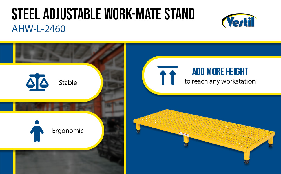 Often times work areas can be ergonomically unfriendly places. Those conditions can be even further exaggerated when different shift employees work on the same equipment. But, with an adjustable work-mate stand it's easy to elevate workers to new heights! If floors or surfaces are uneven, don't worry, each leg is adaptable and can be lowered or raised to best fit the circumstance. Whether you are looking for a single person design or a model that can accommodate multiple users, we've got it! All sizes have four (4) legs except the 60", 72", and 96" long models which have six legs.