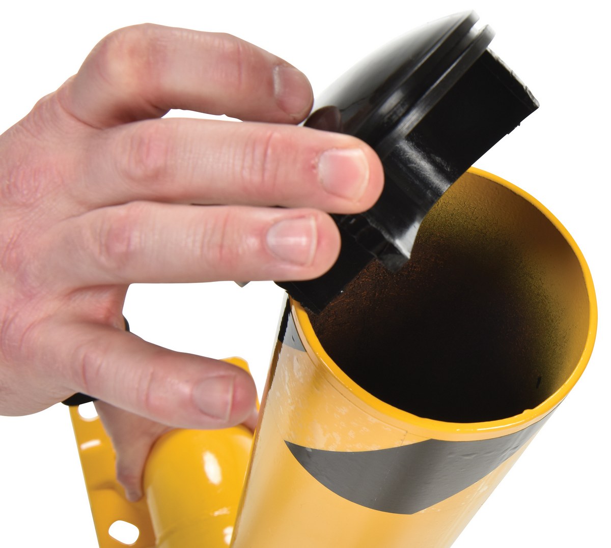 Unique design features offset base plate that won't interfere with traffic. Base plate includes (4) pre-drilled mounting holes (mounting hardware is sold separately). Removable plastic top cap and black/yellow safety tape included. Heavy-duty welded steel construction with a powder coat safety yellow finish is standard.