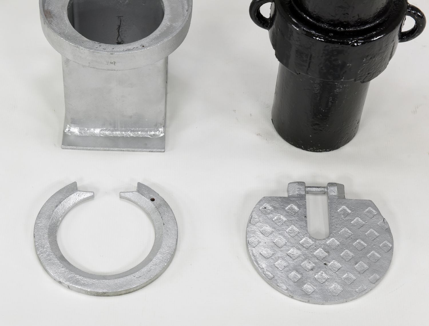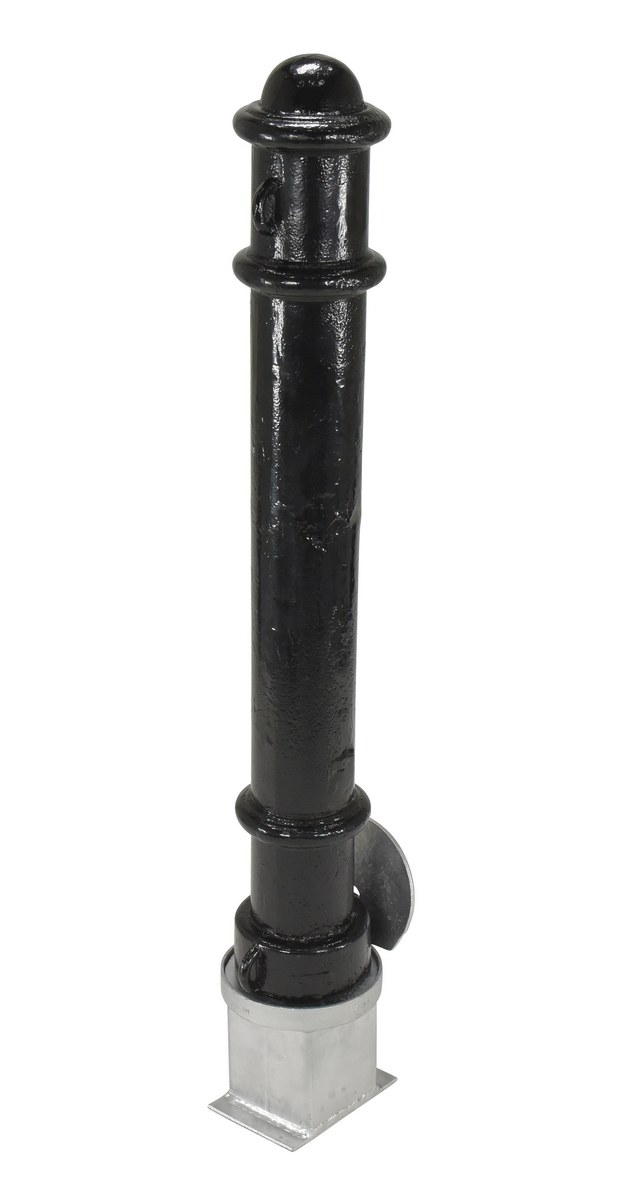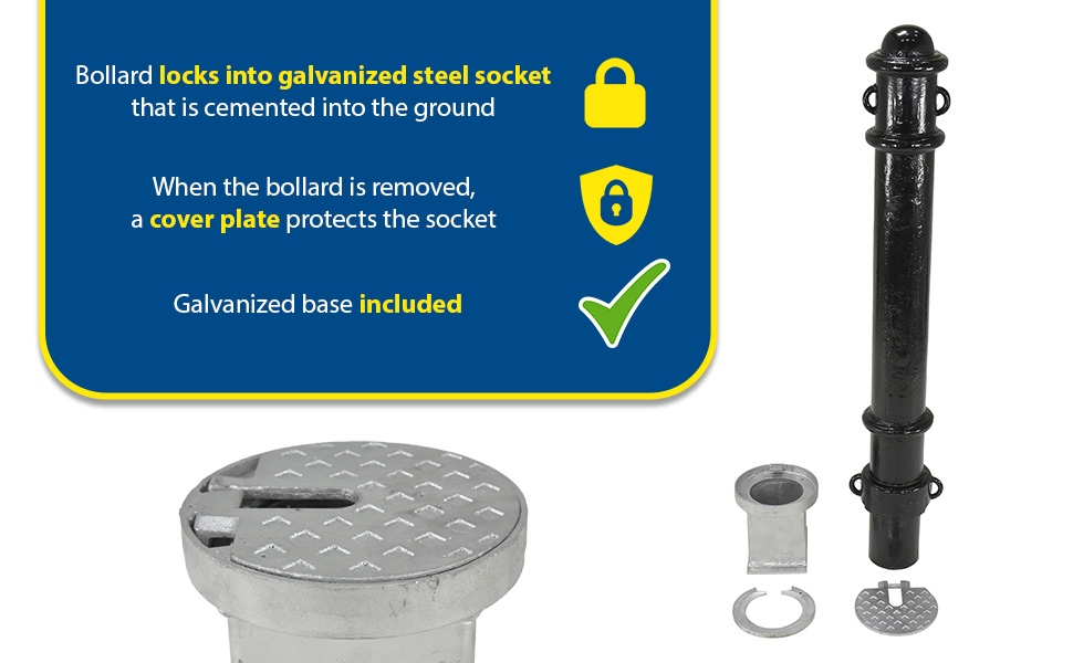 BOL-OR-40-BK, locks into a galvanized steel socket that is cemented into the ground. When the bollard is removed, a cover plate protects the hole leaving no protrusion above the surface. Galvanized base is included with the bollard.
