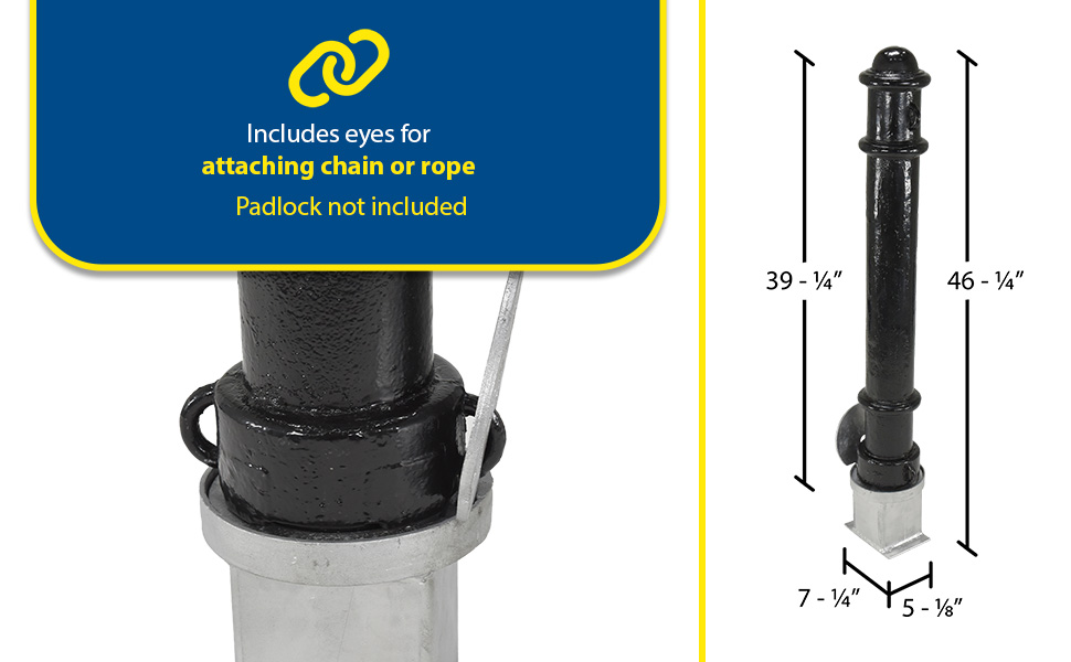 Provide an attractive yet functional barrier to vehicle access and parking. Bollards are 4-1/2" in diameter, while rings make the overall diameter 6". Padlock not included. Powder coat black finish. Includes eyes for attaching chain or rope.