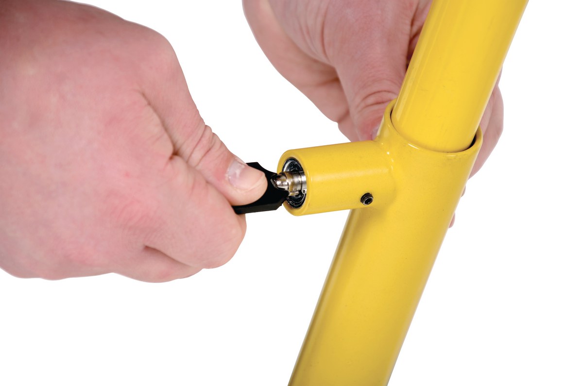Secure an individual parking place from unwanted trespassing. Hinged parking hoop is constructed of cast steel with a UV resistant safety yellow baked-in powder-coated toughness on model PARK-P-38-S. Model PARK-P-38-ZN is made of steel construction. In the horizontal position the parking hoop allows free passage for cars and pedestrians. When engaged, the parking hoop is both a visual and safety barrier. Stands on three (3) hinged legs for better stability and resistance. Easy to operate. Secures in both open and closed position via internal lock, two (2) keys included. Reflective bands and six (6) 3/8" x 3" concrete anchors for securing bollard to concrete included.