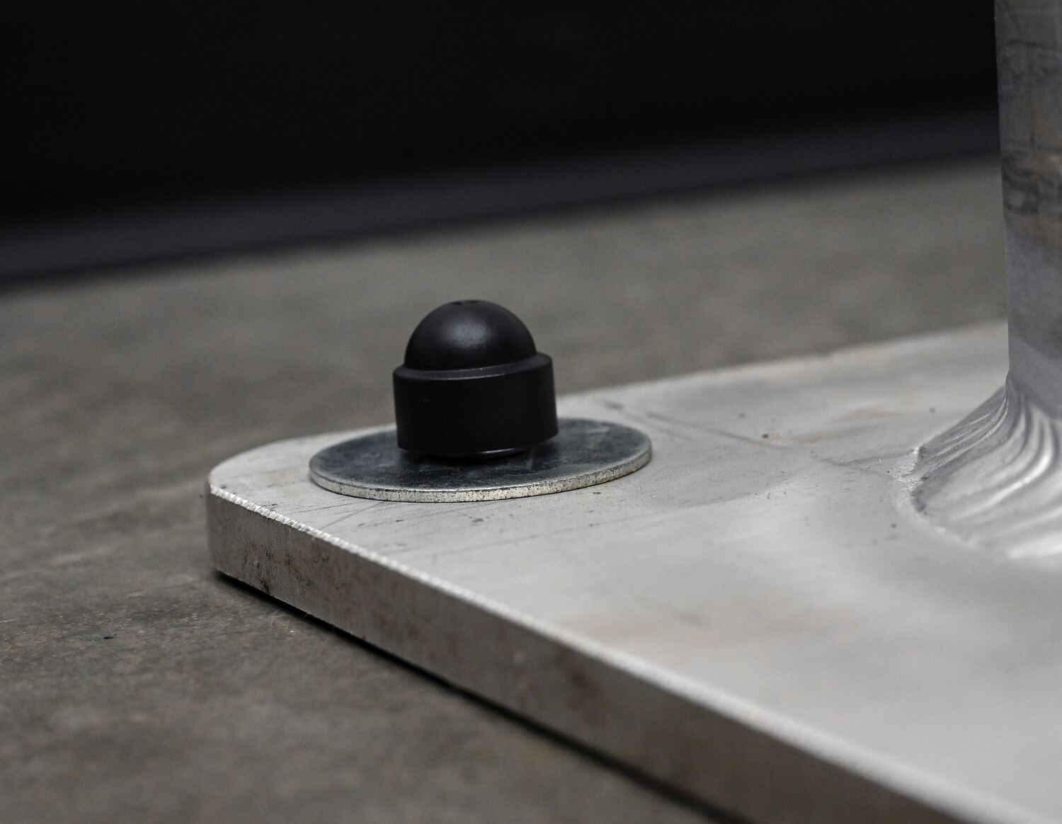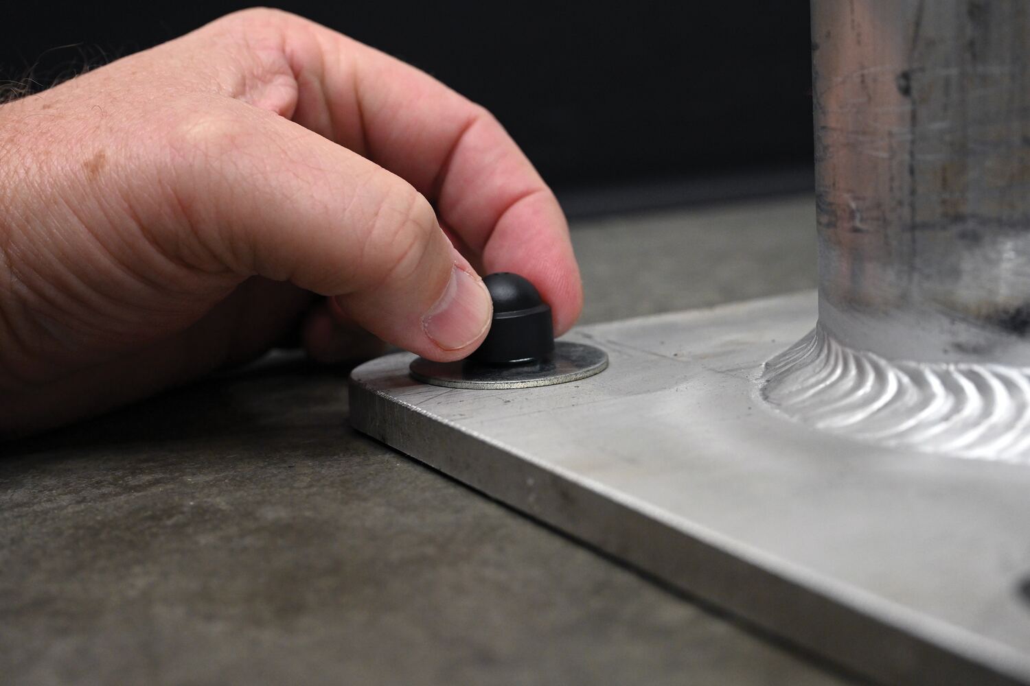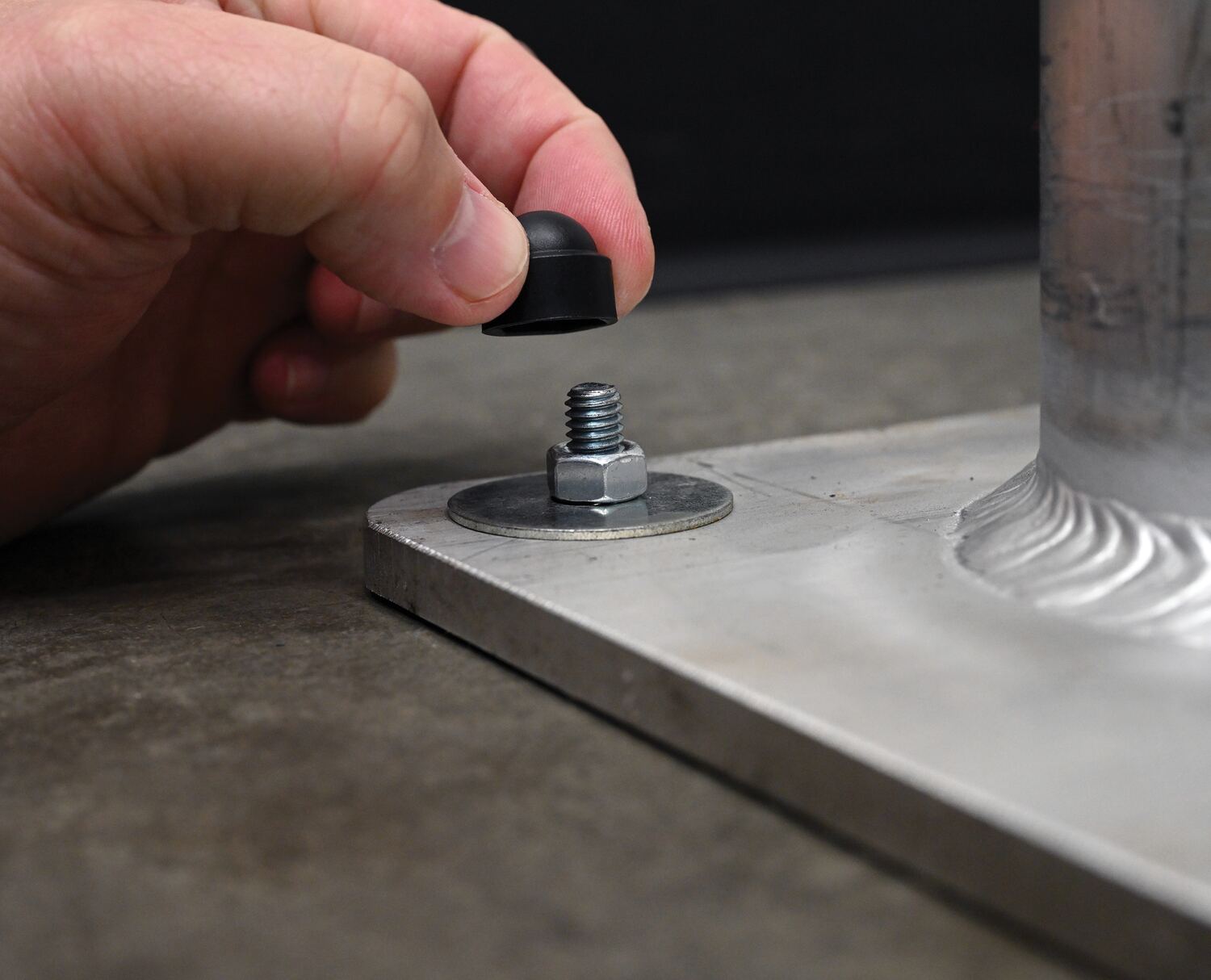 Bolt Covers are designed to finish and protect bolt heads. They have an easy press fit installation over the existing nut. Molded black plastic construction. Plastic Hardware Caps snap over the top of anchor bolts and washers to protect from weathering.