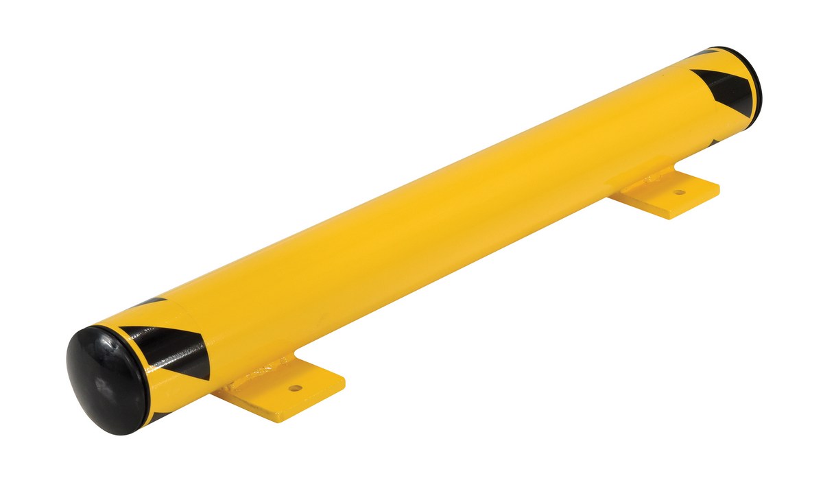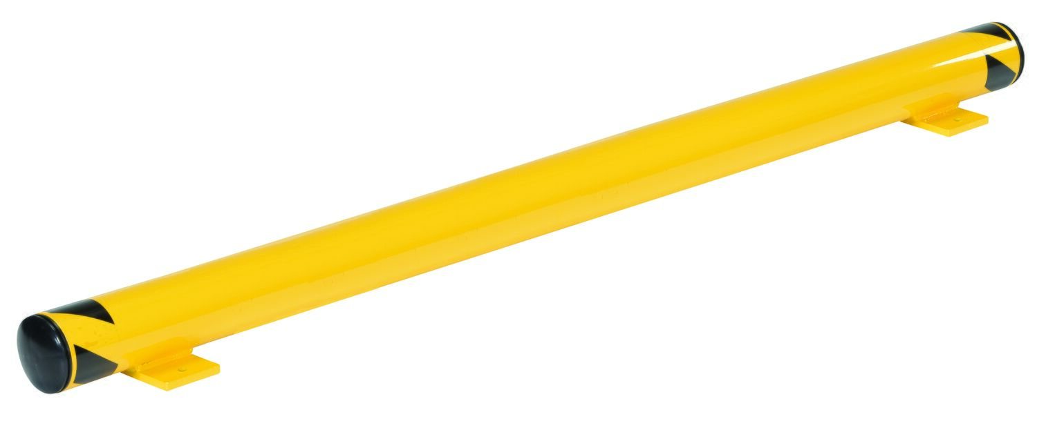 Unique design offers horizontal crash protection. Base plate includes four pre-drilled mounting holes. Removable plastic end caps. Welded steel construction with a yellow baked-in powder coat finish for toughness.