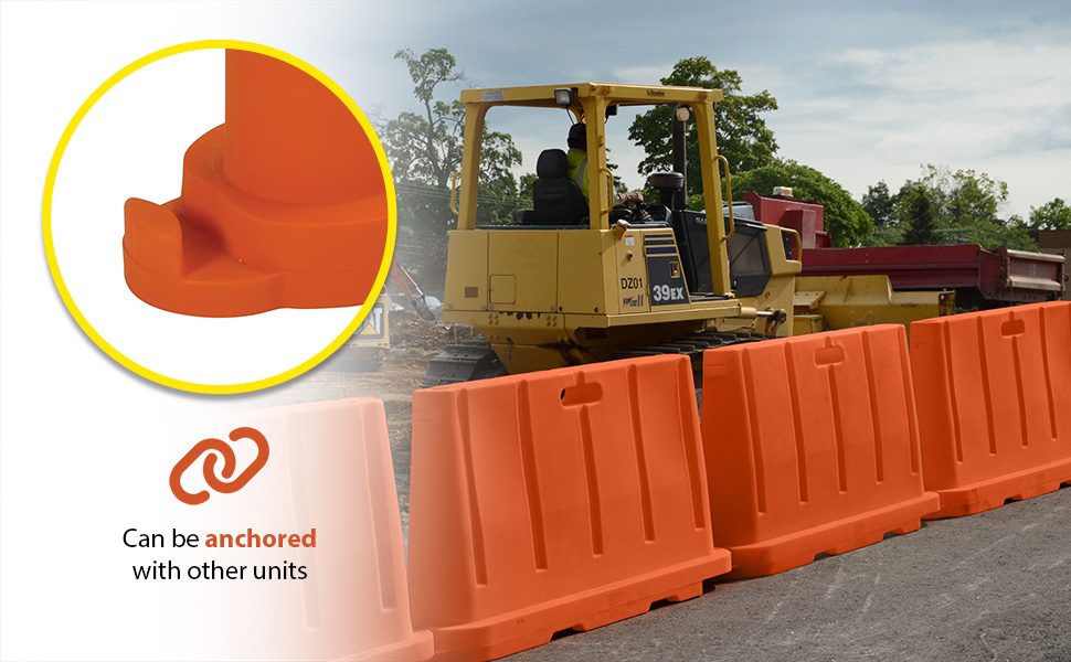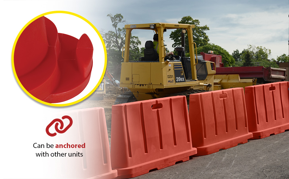Uses 80% less storage space! Common uses include: Crowd & traffic control, area delineation, security, pedestrian protection, construction worker protection, restrict access to areas, factory & warehouse settings. Standard Features: Material thickness is 0.150" Empty weight is 37 Lb. Colors are consistent with ANSI Z535.1 safety colors Manufactured of virgin polyethylene material with UV stabilizer Overall size is 76-1/2"L X 16"W x 36"H (Effective connected length is 72") Hollow base may be filled with 5.4 gallons of water for added weight (~45 Lb.) Not for highway use.