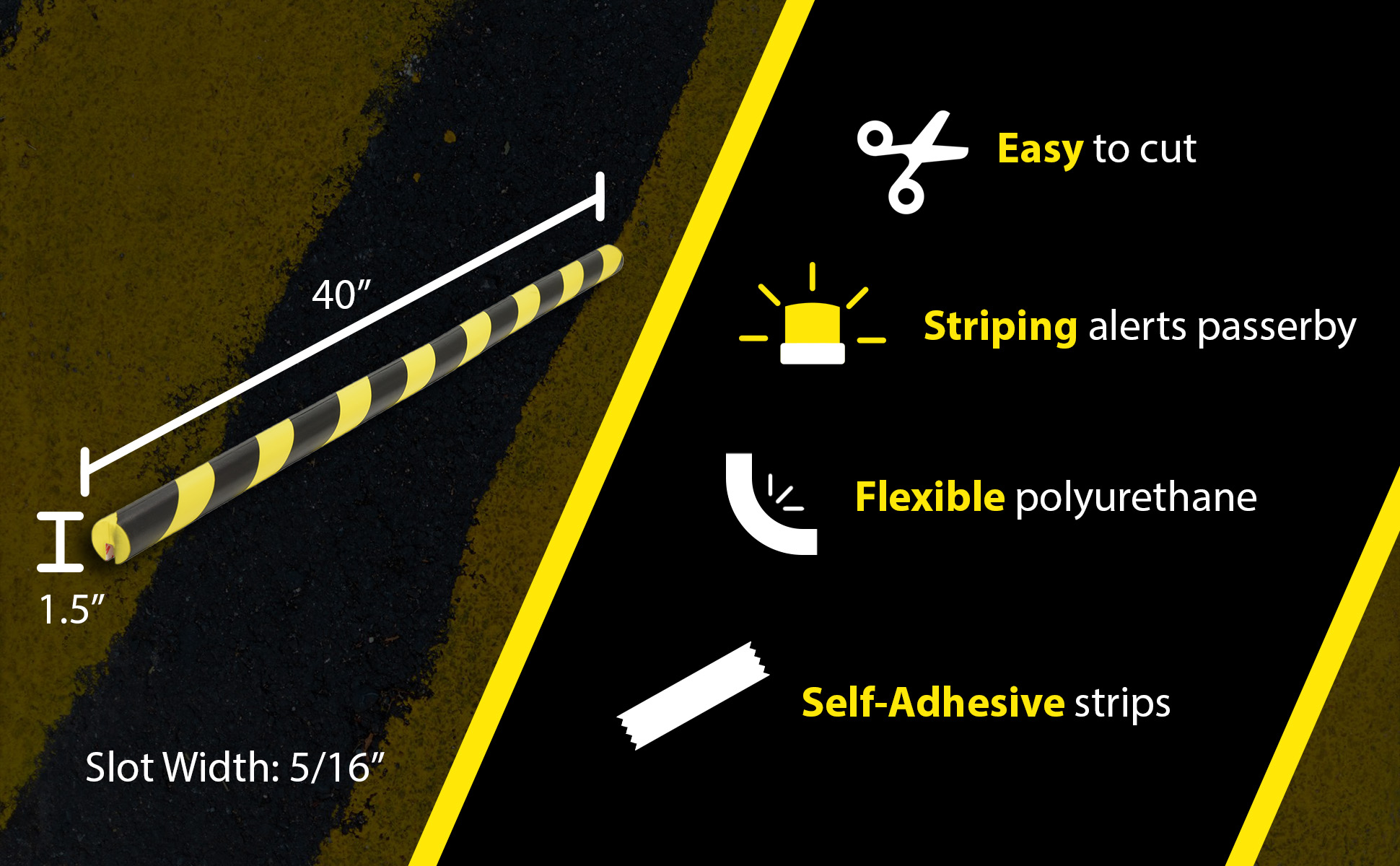 Versatile foam edge guards provided added protection when necessary. Each guard is manufactured from flexible foam that conforms to slightly irregular angles and surfaces Black and yellow alert striping. Sold in lengths of 40", easy to cut to custom lengths. Mounts with self-adhesive strips. Includes double sided tape for adhering.