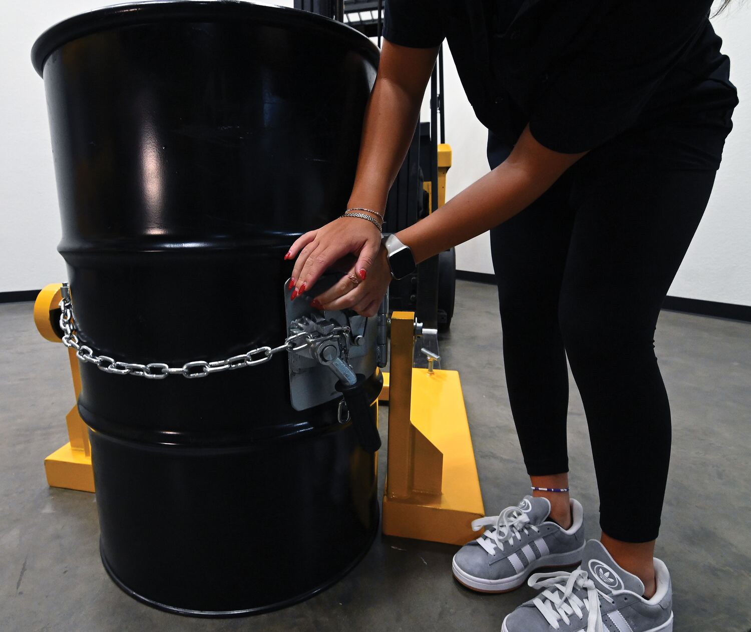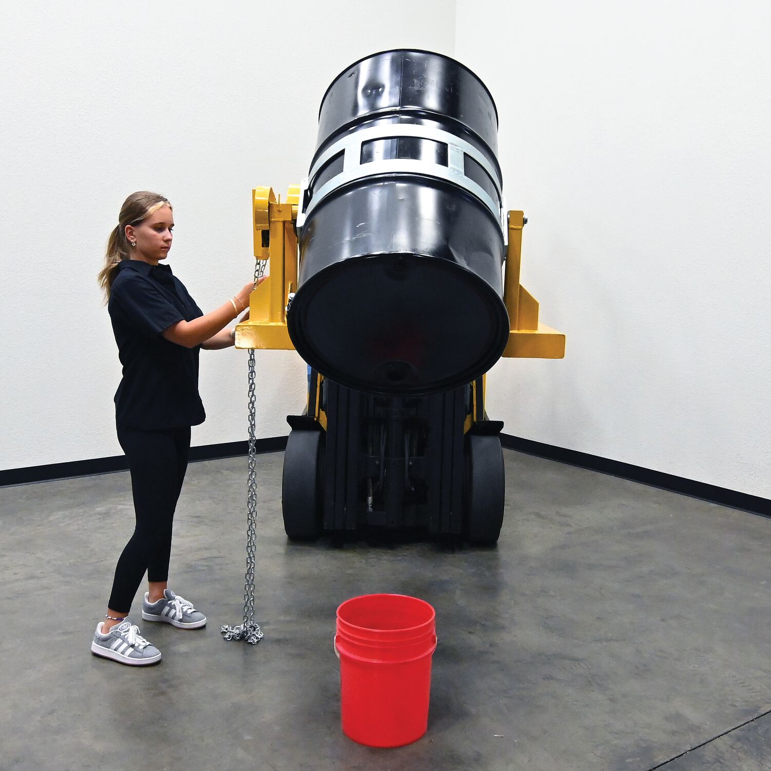 This product allows you to easily transport and rotate 55-gallon steel drums using a fork truck. Each standard unit is provided with a 15 foot long chain to allow the drum to be rotated up to 360 degrees from the fork truck operator's seat. Fork pockets measure 7-5/8"W x 2-5/8"H usable, except DCR-205-8 and DCR-205-15 usable is 7" W. DC powered units include (2) two 12V batteries, on-board charger, battery charge indicator gauge, and hand held control on a 4 ft. to 20 ft. long coil cord. Safety restraint is used to secure unit to fork truck. Bung Nut Wrench, model BNW-I-W, is also included for opening and closing drums.