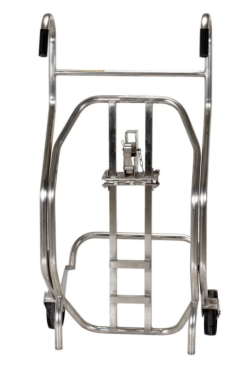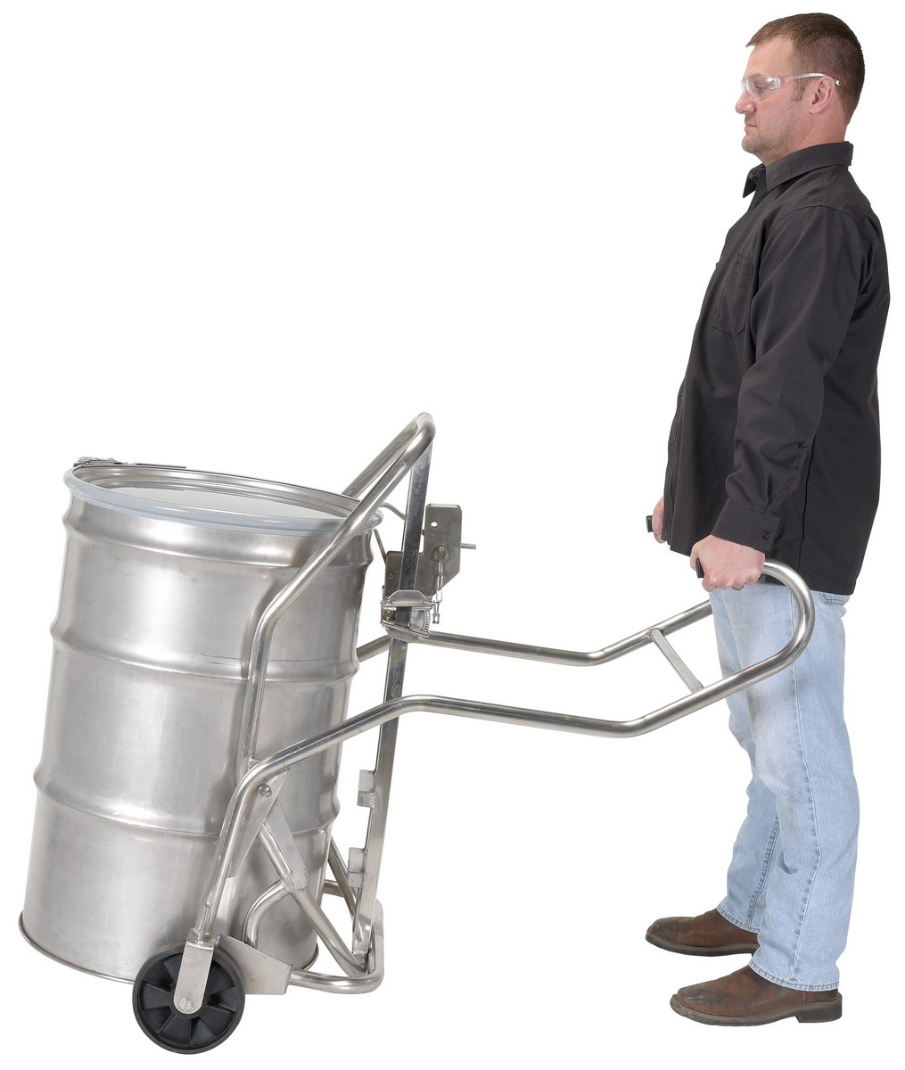 model DBT-SS, Tilt and lower drums to a horizontal position for dispensing. Grips all types of steel 30, 55, & 85 gallon drums and most rimmed plastic and fiber drums. Robust, noncorrosive design - 304 all stainless steel construction. Adjustable chime hook helps to secure the drum. Kickstand for holding the unit in stand-up position. 4-wheel design offers exceptional maneuverability through tight areas. 4-1/2" ground clearance with four (4) 8" x 2" nylon wheels.