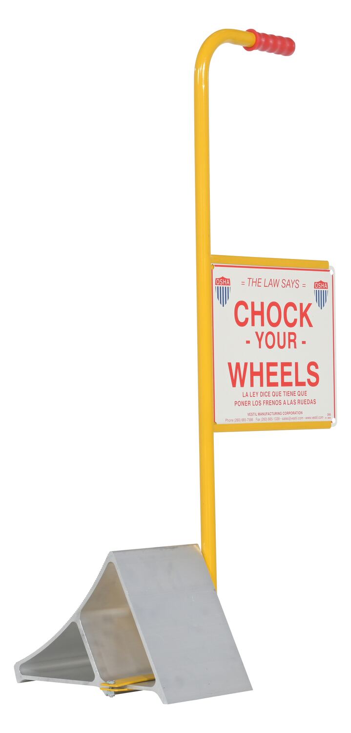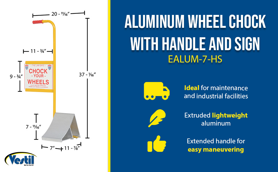 EALUM-7-HS EALUM-7-HSAluminum Wheel Chock with Handle and Sign 7-11/16 In. x 20-11/16 In. x 37-1/16 In. Silver/YellowUsable Chock Width (in.): 7