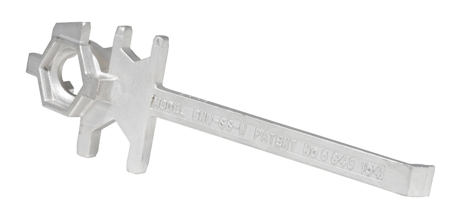 Specialty Bung Nut Wrenches are available in cast steel with polished zinc finish, non-sparking aluminum or non-sparking bronze alloy to meet many applications. These multipurpose drum tools not only open and close drum bungs or plugs, they also work as a bung wrench, ring wrench and faucet wrench all in one! Wrenches are universal in which they fit all types of industrial drum plugs and bungs in metal or plastic. The angled handles on model BNW-I-W and BNW-B-W protect knuckles in most positions. Durable cast steel does not bend, break or chip. Eliminate the need for extra tools with these multifunctional drum wrenches! Patent pending.