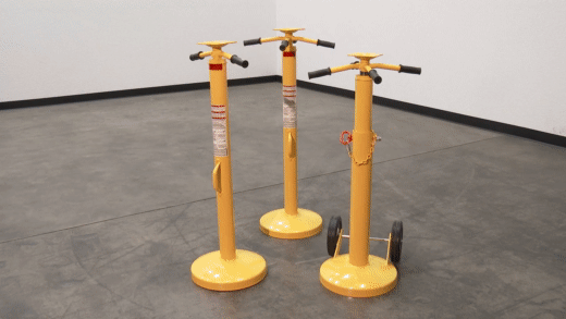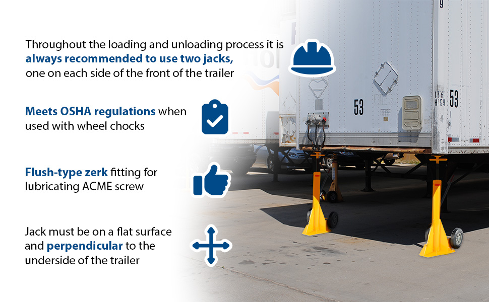 Trailer Stabilizing Jacks are used to prevent up-ending of semi-trailers when they are not connected to a tractor during loading and unloading operations. Throughout the loading and unloading process it is always recommended to use two jacks, one on each side of the front of the trailer. The trailer must be situated on a flat, stable and improved (preferably concrete) surface, while the jack sits perpendicular to the underside of the trailer. Every jack is built of a high strength steel construction with a flush-type zerk fitting for lubricating ACME screw. A yellow powder coat finish and a reflective collar for visibility at night are both included. Each jack meets OSHA regulations when used with wheel chocks. **The color of handles included with models may vary between red and black**