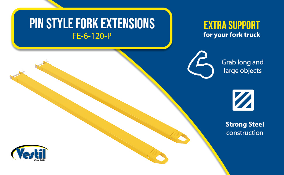 FE-5-120-P FE-5-120-PSteel Pin Style Fork Extensions 5 In. x 120 In. 4000 Lb. Capacity YellowUniform Capacity Per Pair (lb.): 4,000