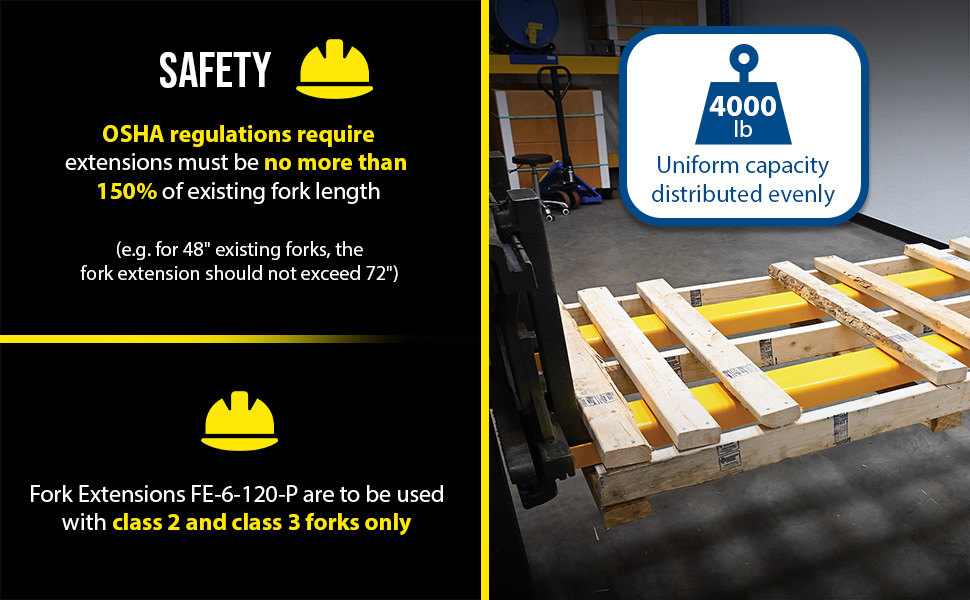FE-6-120-P FE-6-120-PSteel Pin Style Fork Extensions 6 In. x 120 In. 4,000 Lb. Capacity YellowUniform Capacity Per Pair (lb.): 4,000