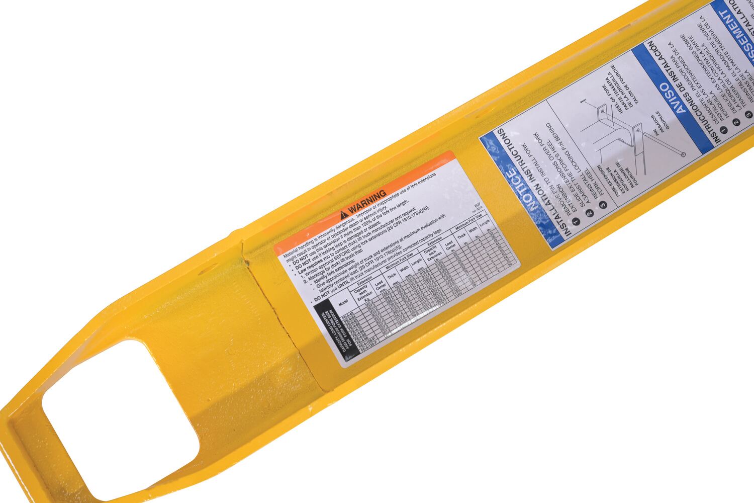 FE-4-96-P FE-4-96-PSteel Pin Style Fork Extensions 4 In. x 96 In. 4000 Lb. Capacity YellowUniform Capacity Per Pair (lb.): 4,000
