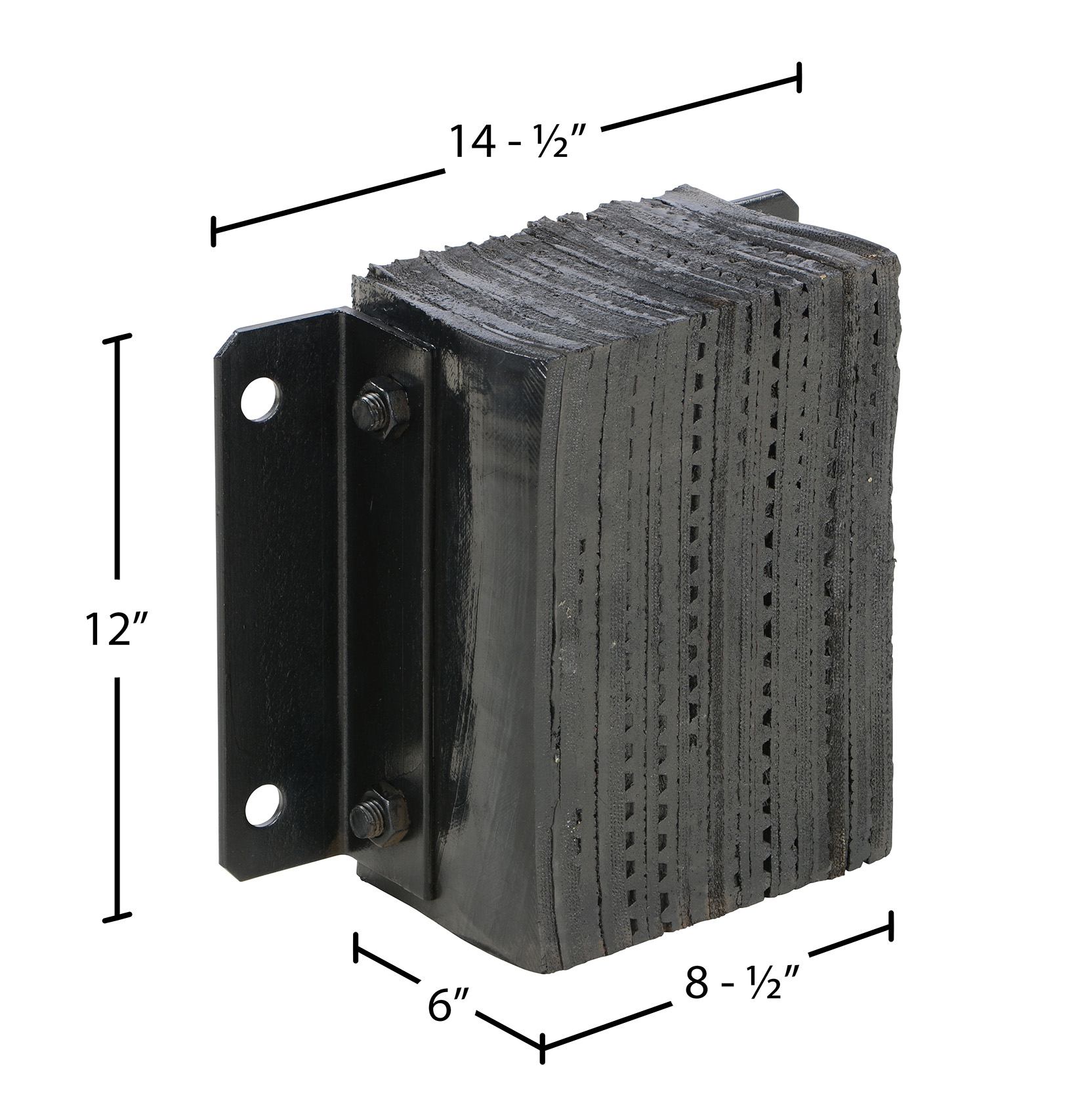 The laminated Dock Bumper provides durable, economical protection for loading docks and trailers. This unit is constructed of fabric reinforced rubber from recycled truck tires. The pads are laminated between painted structural angles and held together with steel tie rods. The width is bolt hole center to bolt hole center. Installation hardware sold separately.