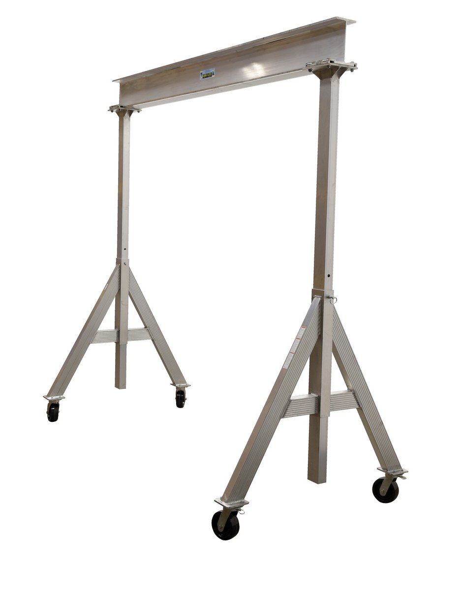 Aluminum Adjustable Height Gantry Crane with Phenolic Casters 12 Ft.Wide x 12 Ft. Max Usable Height 6,000 Lb. Capacity SilverThe adjustable height Aluminum Gantry crane combines lightweight and rigid, sturdy construction into one unit. The all aluminum construction of this gantry crane makes it corrosion resistant and perfect for outdoor use. The lightweight I-beam allows for simple height adjustments. All pinned connections make it possible for single person set up and take down in just minutes. Included are two (2) straps, allowing one person to transport the gantry crane in one neat package.