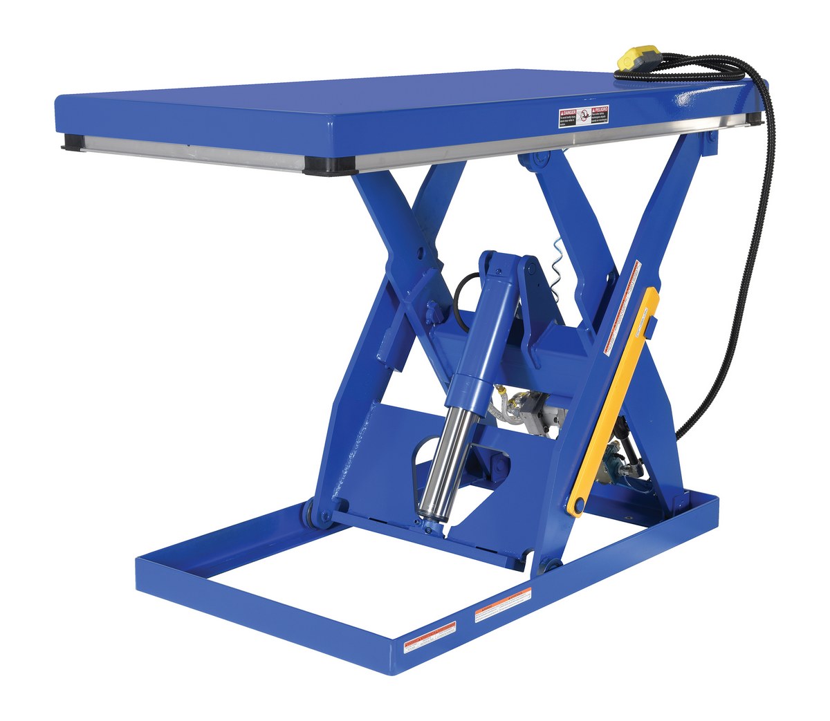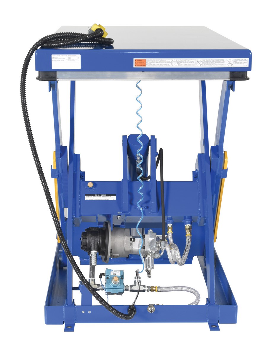 Steel Rotary Air Hydraulic Scissor Lift Table 30 In. x 60 In. 3,000 Lb. Capacity BlueThe rotary air/Hydraulic scissor lift table utilizes the convenience of factory air to power the lift table. Simply connect to an air supply through a filter, regulator, lubricator, and you will have a lift table suitable for a wide range of applications and operating environments. It features a pneumatic upper travel limit switch, safety toe guards, cylinder with internal safety velocity fuse, two button hand control, and life-time lubricated sleeve bearings.