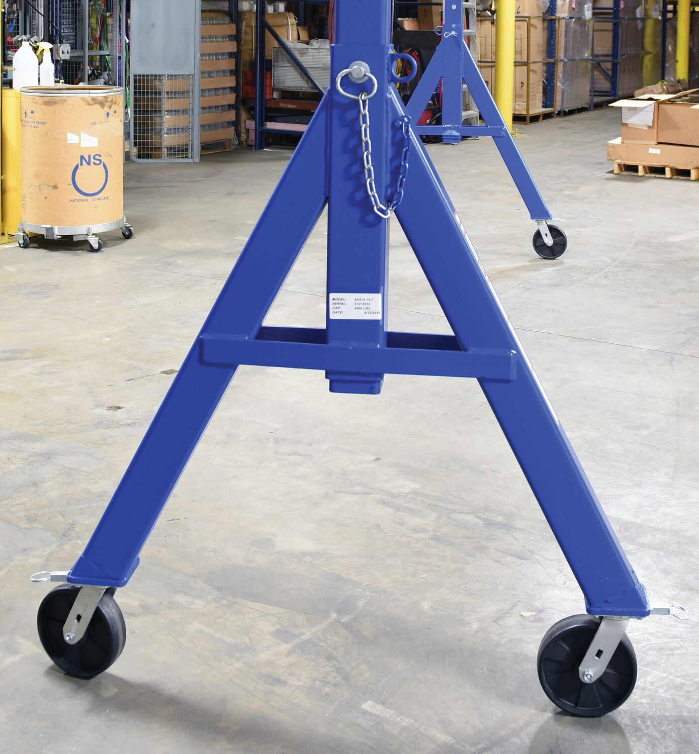 The industrial steel Gantry crane is designed for transporting and positioning materials along the beams length. The solid steel construction will provide years of service. Unit comes standard four (4) position locking swivel casters with roller bearings. Locks the rigging in 1 of 4 positions; you can set the wheels and push the gantry crane forward, back, left or right. There is an optional total locking casters that lock the rigging in any position and locks the wheel from rotating. More economical and flexible than permanent cranes and features a quick setup design. Painted blue finish with warning and operating stickers and complete owner's manual. Designed for semi-permanent or permanent applications. Requires assistance from fork truck to set-up.
