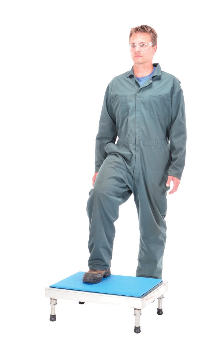 The adjustable work-mate stand minimizes fatigue by elevating workers to heights that are comfortable and ergonomically correct. Especially useful when multiple shift employees operate the same piece of machinery. The ergonomic matting deck style provides comfort for the operator who stands all day. The height of each leg can be adjusted individually to ensure proper working height.