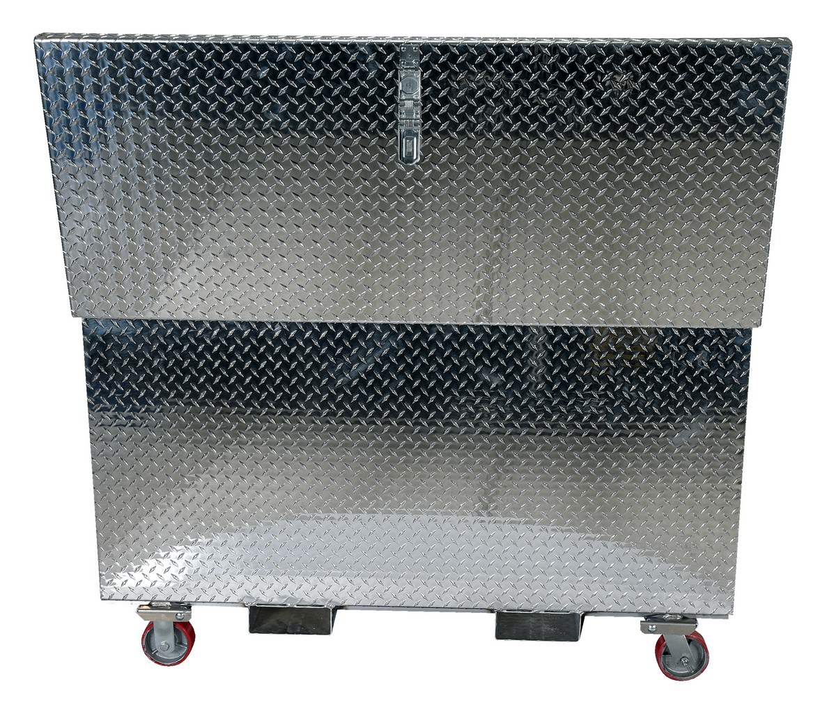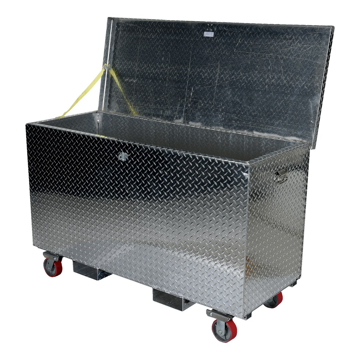 The Aluminum portable toolbox is excellent for storing and transporting equipment. The heavy duty welded aluminum tread plate construction is designed to tolerate the toughest of environments. Additional features also include ergonomically friendly carrying handles on each end for smooth manual transporting and a hinged lid which includes a lockable double hinged hasp for added security. Casters are included for simple portability between work areas. Fork pockets are attached to the units underbelly for lifting and maneuvering between areas.