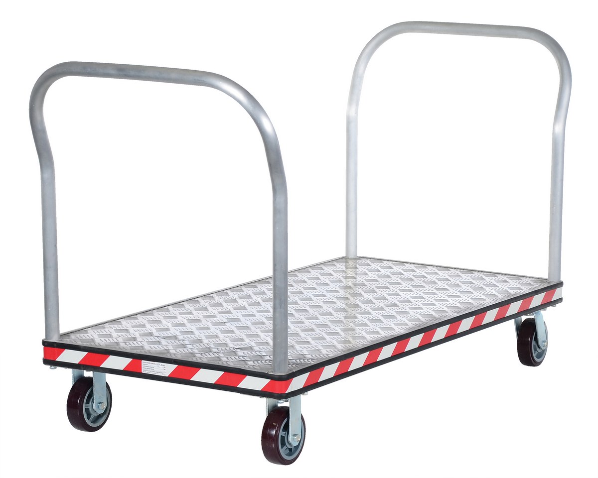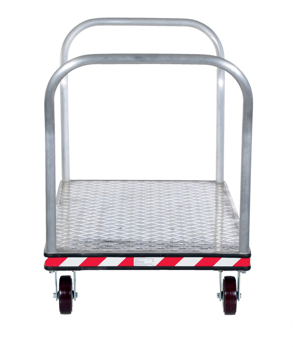 An aluminum tread plate platform truck is a great addition a variety of settings. Fitted with non-marking rubber protective buffer strip to protect walls and door frames during transit. Design allows items to be loaded and unloaded from multiple sides. The poly-on-poly casters roll smoothly over surfaces.