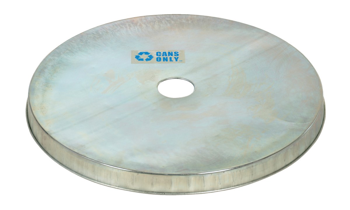 This Galvanized steel drum cover is for a fifty-five (55) gallon open head (tight head) drum. Manufactured from galvanized steel. Cover drum tops for added protection. Perimeter rim is beaded for safety. Recycling top includes a "cans only" decal.