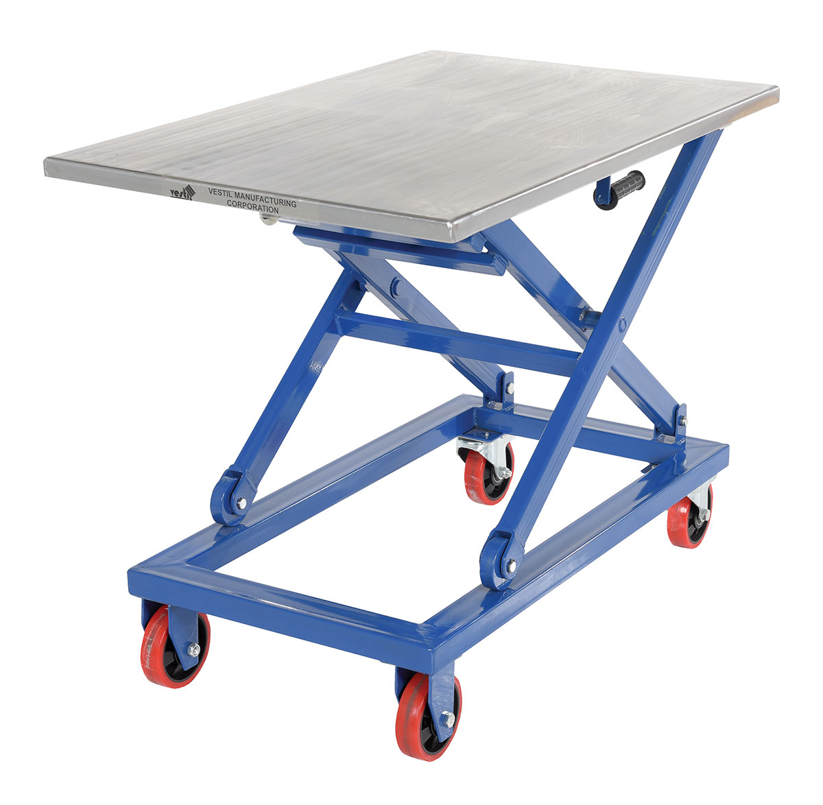 Steel Mechanical Scissor Cart 25-1/2 In. x 39-1/4 1000 Lb. Capacity BlueWhen lifting and transporting are both essential, look no further than the mechanical scissor cart. The centrally located hand crank allows the user to raise and lower the platform to a more exact level. A large platform gives the ability to load items in a variety of sizes. Since the platform can be maneuvered to a specific height, the unit can be positioned to best fit the users needs for a more ergonomically friendly experience. Poly casters are included for a smooth roll on a variety of surfaces.