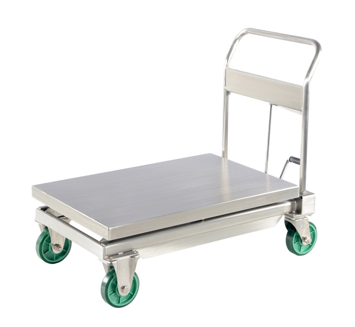 Stainless Steel Hydraulic Scissor Cart 35-1/2 In. x 23-1/2 In. 1100 Lb. Capacity SilverThe Hydraulic elevating cart minimizes worker bending and lifting through its ergonomic design and portability. Material can be easily loaded onto a cart from a table, lowered to a safe transporting height, and raised to unload at destination. The foot pump includes a soft-lowering down valve. The unit moves easily on four polyurethane casters; two swivel with brakes and two rigid. Features a two-speed foot pump. Foot pump pedal, pump assembly and hydraulic cylinder are chrome plated. Rest of the unit is fully stainless construction. Features an internal safety velocity fuse in each cylinder.