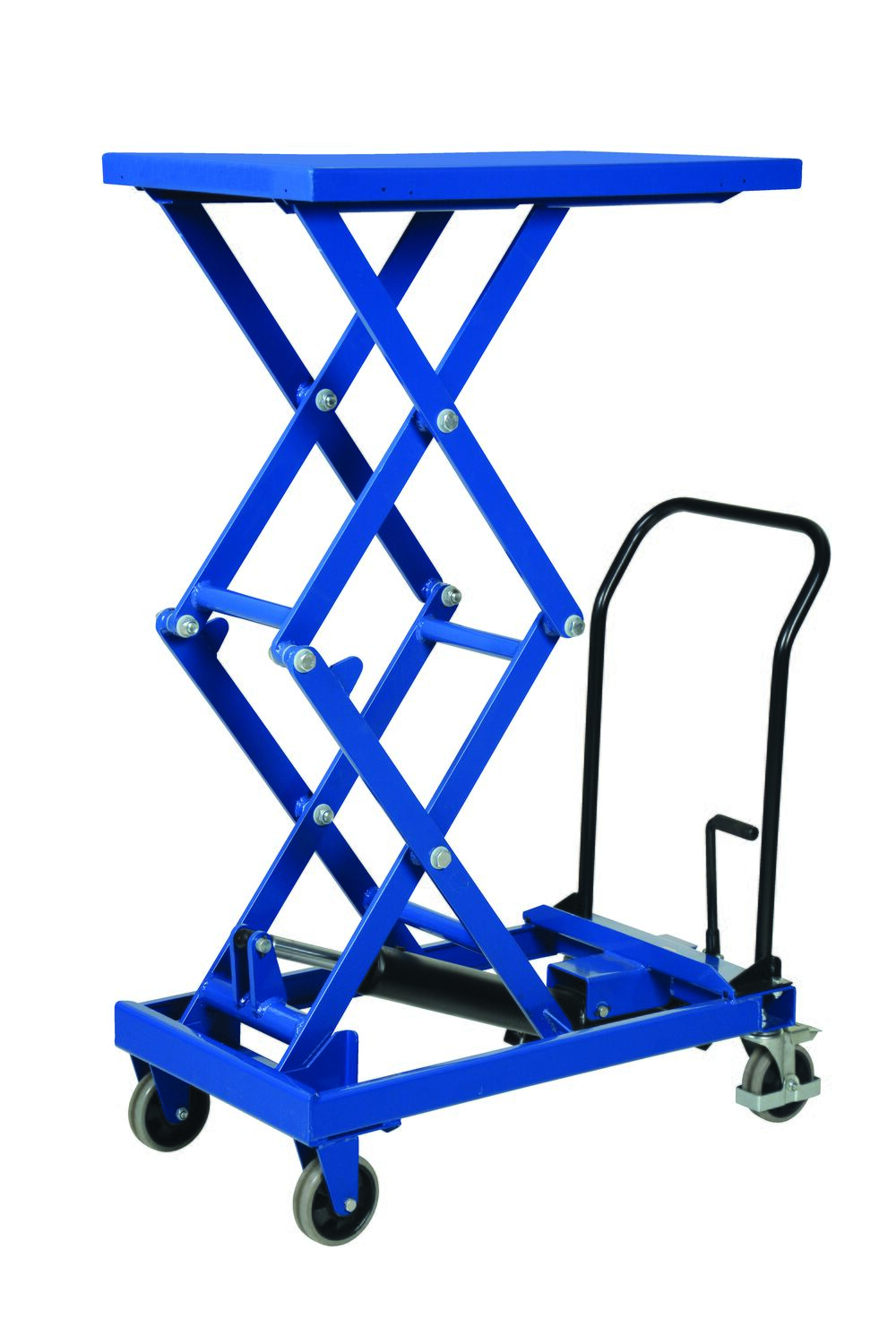 Steel Premium Double Scissor Cart with Foot Release 19.5 In. x 33 In. 300 Lb. Capacity BlueThe premium scissor lift cart is constructed of heavy duty steel and designed to withstand the most demanding industrial environments. The simplicity and compactness of these products make them ideal for lifting and transporting loads, order-picking, die handling, and for use in support of assembly operations. There is little exertion required to raise and lower the deck due to the high quality foot-actuated, single speed hydraulic pump. The hydraulic system is equipped with an overload protection valve. Each cart has safety stops to prevent an empty deck from lowering while performing maintenance. A unique tilt-up table top allows for safe and easy maintenance. The two rigid front casters and two rear swivel polyurethane casters with brake provide a high degree of maneuverability; each swivel wheel is protected by guards and is equipped with brakes.