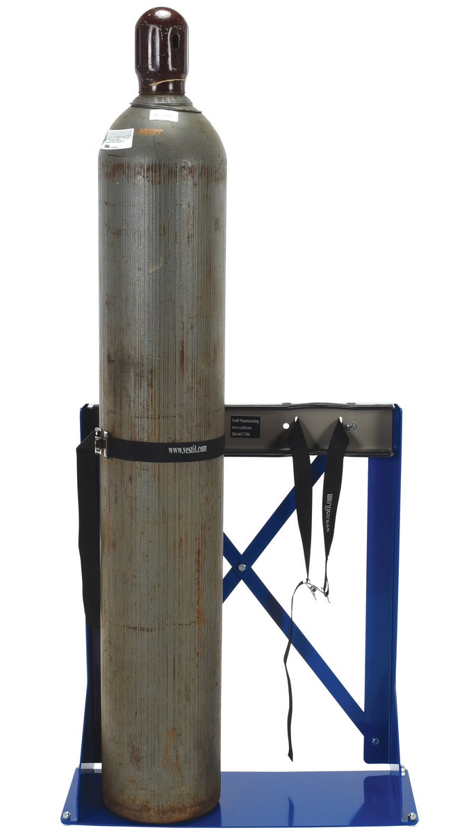 Cylinder Bracket Stand 2 Cylinder Capacity BlueThe floor-mount Cylinder bracket is easy to install and designed for easy consumer use. Simply secure cylinder with strap. Edges are protected with rubber guards. Formed steel construction. Stands feature a powder-coat blue finish, steel brackets feature gray painted finish.