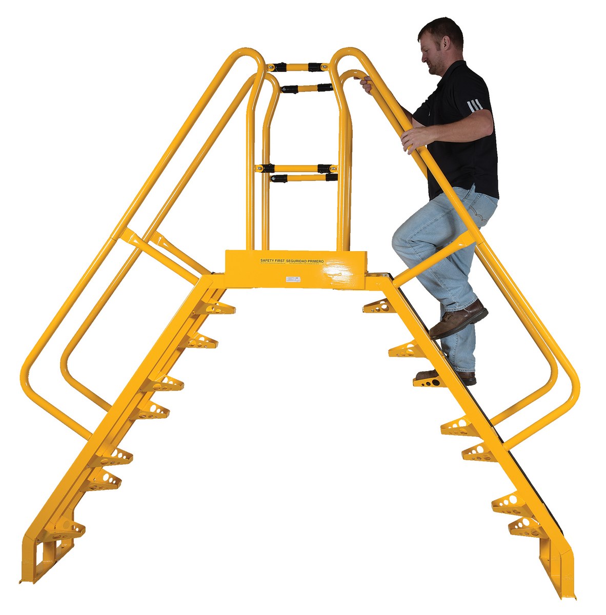 Steel Alternating Crossover Ladder 16 Step 56 Degrees 106 In. x 103 In. 350 Lb. Capacity YellowMount this alternating step cross-over ladder where you need permanent access at crossover points. Alternating step design for shorter overall span than other units. The upper platform features removable two sided high handrail with mid-rail and fixed toe boards to prevent objects from rolling off. Includes lag-down points for securing to floor.