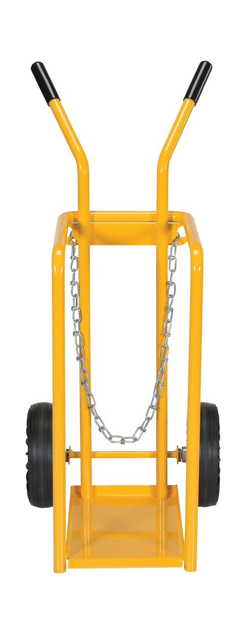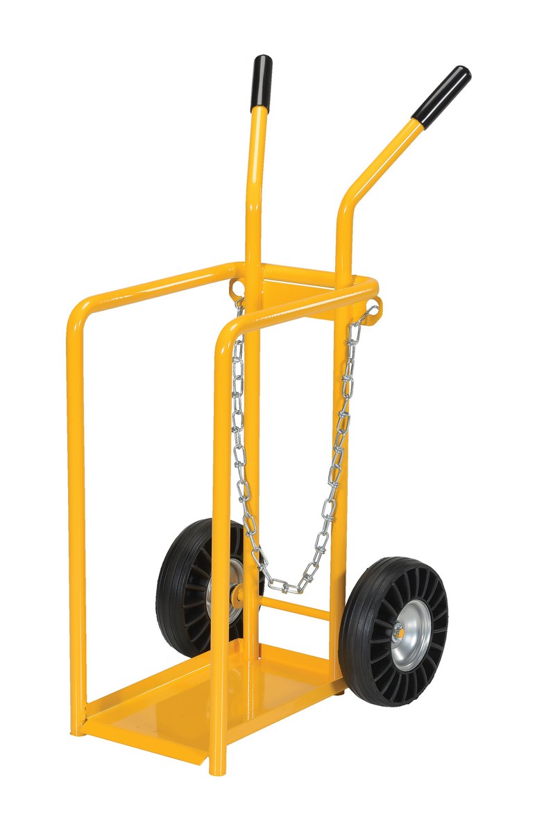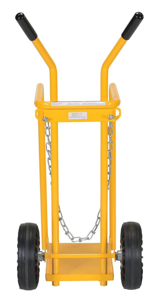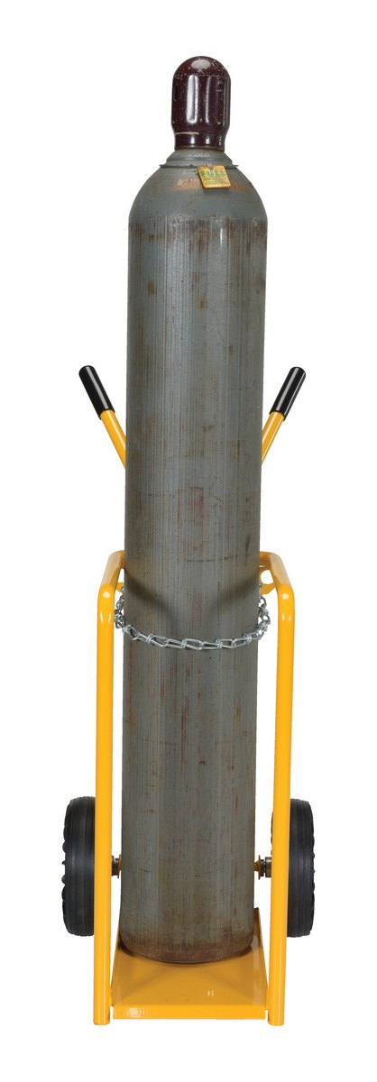 Ideal for transporting cylinders from storage to work space. Capable of handling two 9" cylinders. Chains provide utmost safety. Tilt back design for effortless transportation.